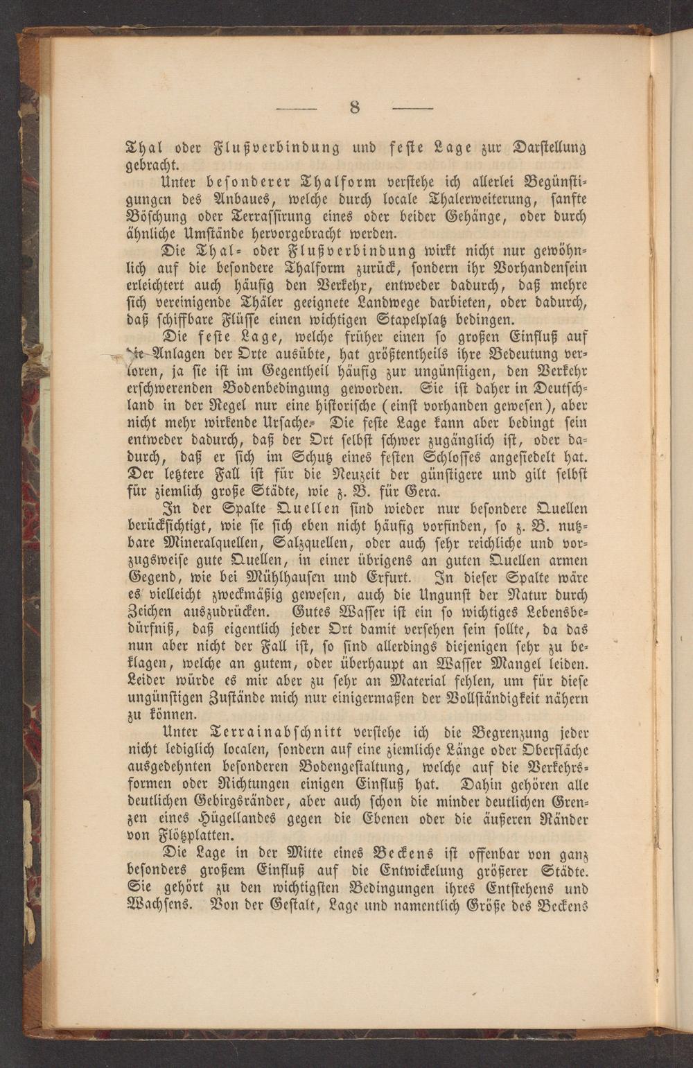 In der Spalte Quellen ſind wieder nur beſondere Quellen berückſichtigt, wie ſie ſich eben nicht häufig vorfinden, ſo z. B. nutz⸗ bare Mineralquellen, Salzquellen, oder auch ſehr reichliche und vor⸗ zugsweiſe gute Quellen, in einer übrigens an guten Quellen armen Gegend, wie bei Mühlhauſen und Erfurt. In dieſer Spalte wäre es vielleicht zweckmäßig geweſen, auch die Ungunſt der Natur durch Zeichen auszudrücken. Gutes Waſſer iſt ein ſo wichtiges Lebensbe⸗ dürfniß, daß eigentlich jeder Ort damit verſehen ſein ſollte, da das nun aber nicht der Fall iſt, ſo ſind allerdings diejenigen ſehr zu be⸗ klagen, welche an gutem, oder überhaupt an Waſſer Mangel leiden. Leider würde es mir aber zu ſehr an Material fehlen, um für dieſe ungünſtigen Zuſtände mich nur einigermaßen der Vollſtändigkeit nähern zu können.