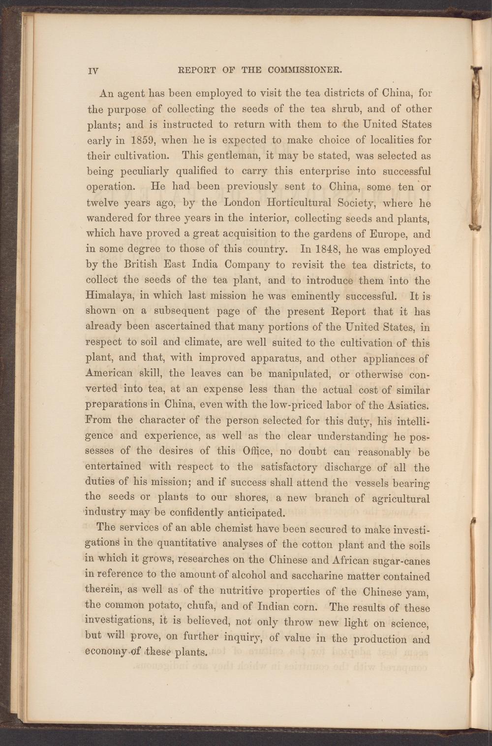 An agent has been employed to visit the tea districts of China, for the purpose of collecting the seeds of the tea shrub, and of other plants; and is instructed to return with them to the United States early in 1859, when he is expected to make choice of localities for their cultivation. This gentleman, it may be stated, was selected as being peculiarly qualified to carry this enterprise into successful operation. He had been previously sent to China, some ten or twelve years ago, by the London Horticultural Society, where he wandered for three years in the interior, collecting seeds and plants, which have proved a great acquisition to the gardens of Europe, and in some degree to those of this country. In 1848, he was employed by the British East India Company to revisit the tea districts, to collect the seeds of the tea plant, and to introduce them into the Himalaya, in which last mission he was eminently successful. It is shown on a subsequent page of the present Report that it has already been ascertained that many portions of the United States, in respect to soil and climate, are well suited to the cultivation of this plant, and that, with improved apparatus, and other appliances of American skill, the leaves can be manipulated, or otherwise con- verted into tea, at an expense less than the actual cost of similar preparations in China, even with the low-priced labor of the Asiatics. From the character of the person selected for this duty, his intelli- gence and experience, as well as the clear understanding he pos- sesses of the desires of this Office, no doubt can reasonably be entertained with respect to the satisfactory discharge of all the duties of his mission; and if success shall attend the vessels bearing the seeds or plants to our shores, a new branch of agricultural industry may be confidently anticipated.