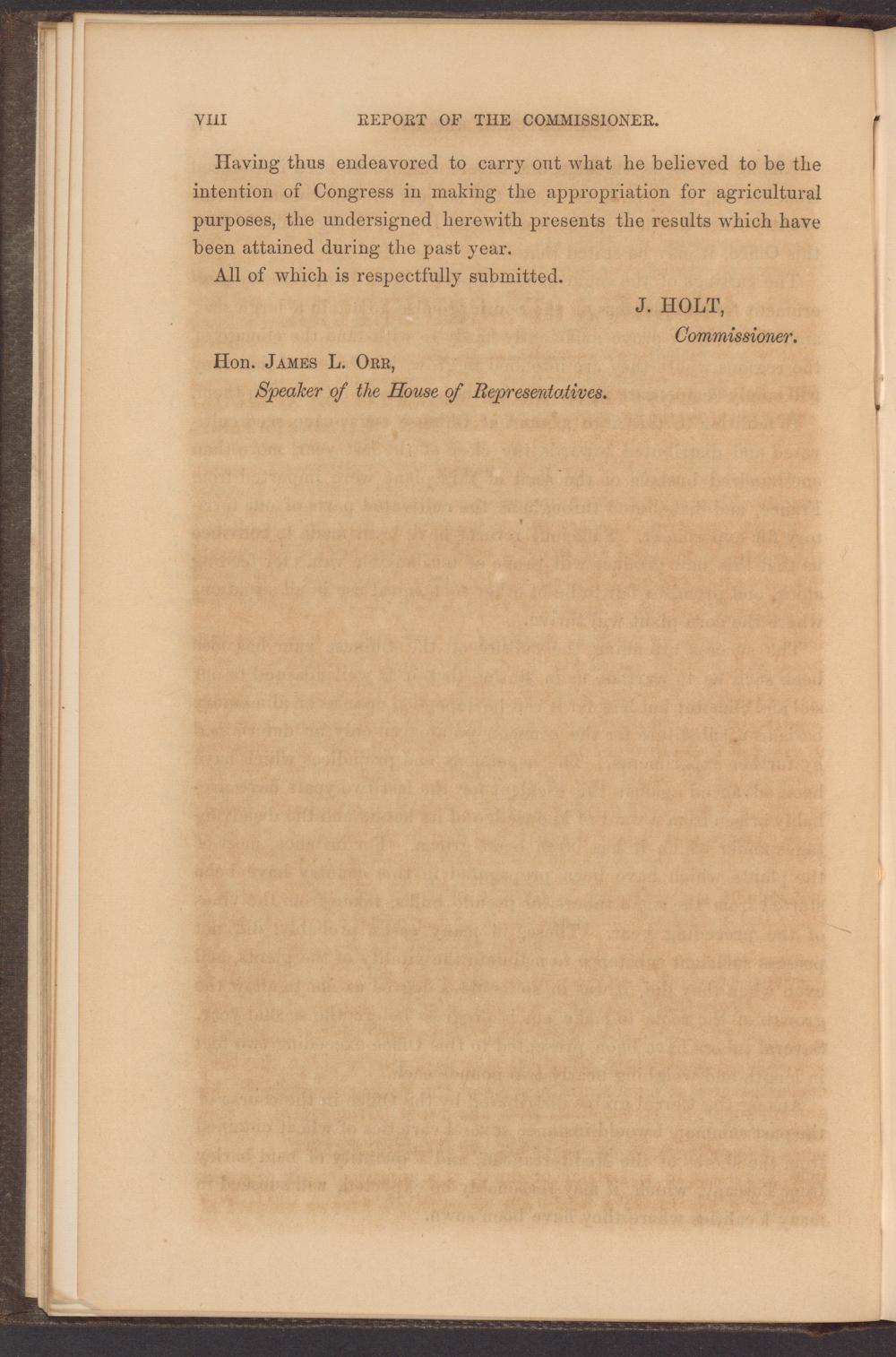 Having thus endeavored to carry out what he believed to be the intention of Congress in making the appropriation for agricultural purposes, the undersigned herewith presents the results which have been attained during the past year.