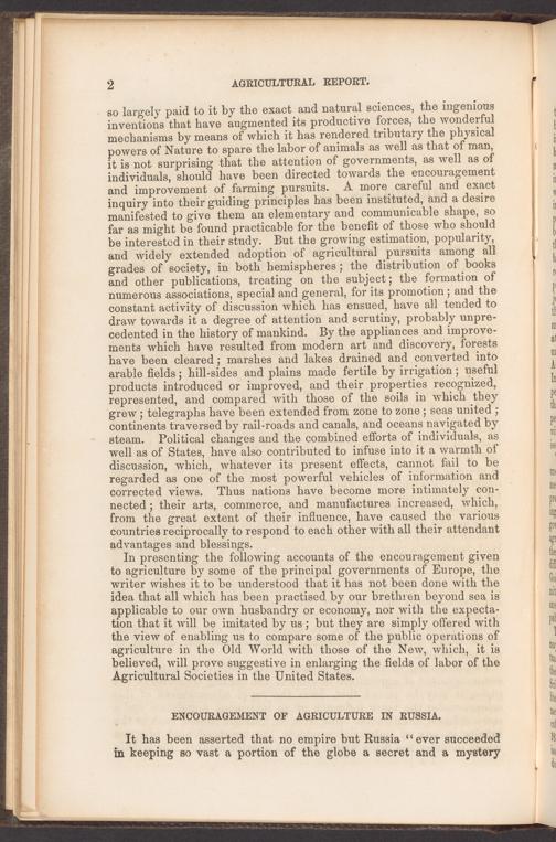 In presenting the following accounts of the encouragement given to agriculture by some of the principal governments of Europe, the writer wishes it to be understood that it has not been done with the idea that all which has been practised by our brethren beyond sea is applicable to our own husbandry or economy, nor with the expecta- tion that it will be imitated by us; but they are simply offered with the view of enabling us to compare some of the public operations of agriculture in the Old World with those of the New, which, it is believed, will prove suggestive in enlarging the fields of labor of the Agricultural Societies in the United States.