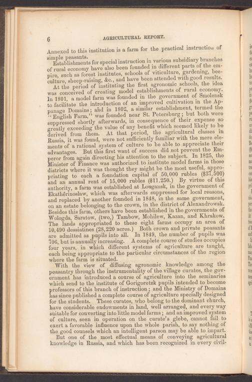 With the view of diffusing agronomic knowledge among the peasantry through the instrumentality of the village curates, the gov- ornment has introduced a course of agriculture into the seminaries which send to the institute of Gorigoretzk pupils intended to become professors of this branch of instruction; and the Ministry of Domains has since published a complete course of agriculture specially designed for the students. These curates, who belong to the dominant church, have considerable endowments in land, well arranged, and every way suitable for converting into little model farms; and an improved system of culture, seen in operation on the curate’s glebe, cannot fail to exert a favorable influence upon the whole parish, to say nothing of the good counsels which an intelligent parson may be able to impart.