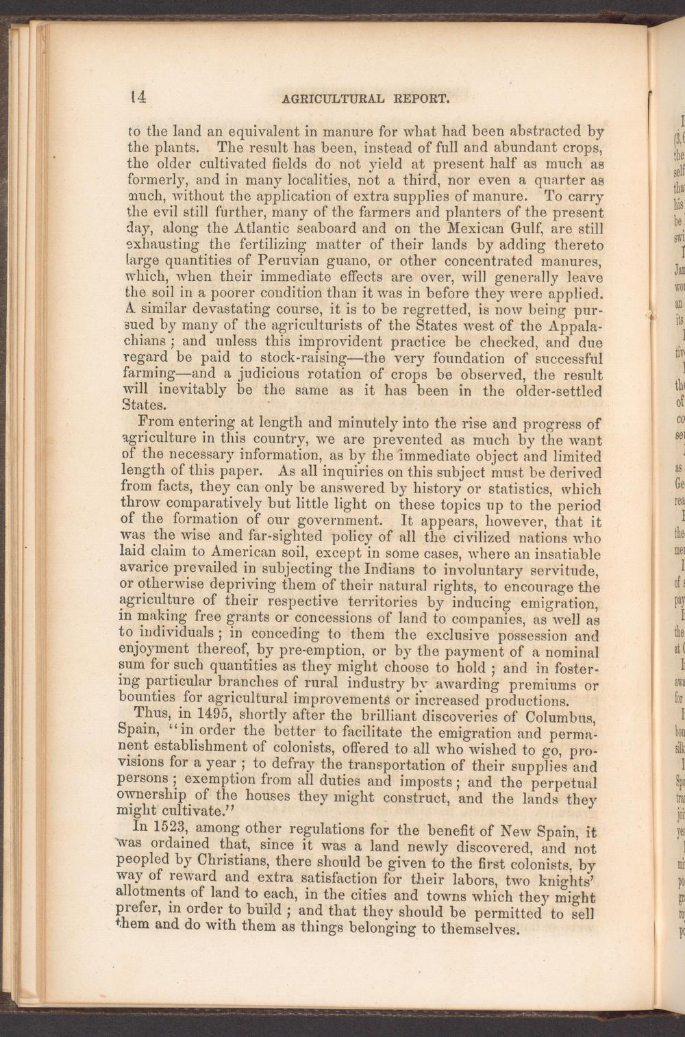 From entering at length and minutely into the rise and progress of agriculture in this country, we are prevented as much by the want of the necessary information, as by the immediate object and limited length of this paper. As all inquiries on this subject must be derived from facts, they can only be answered by history or statistics, which throw comparatively but little light on these topics up to the period of the formation of our government. It appears, however, that it was the wise and far-sighted policy of all the civilized nations who laid claim to American soil, except in some cases, where an insatiable avarice prevailed in subjecting the Indians to involuntary servitude, or otherwise depriving them of their natural rights, to encourage the agriculture of their respective territories by inducing emigration, in making free grants or concessions of land to companies, as well as to individuals; in conceding to them the exclusive possession and enjoyment thereof, by pre-emption, or by the payment of a nominal sum for such quantities as they might choose to Rold; and in foster- ing particular branches of rural industry bv awarding premiums or bounties for agricultural improvements or increased productions.