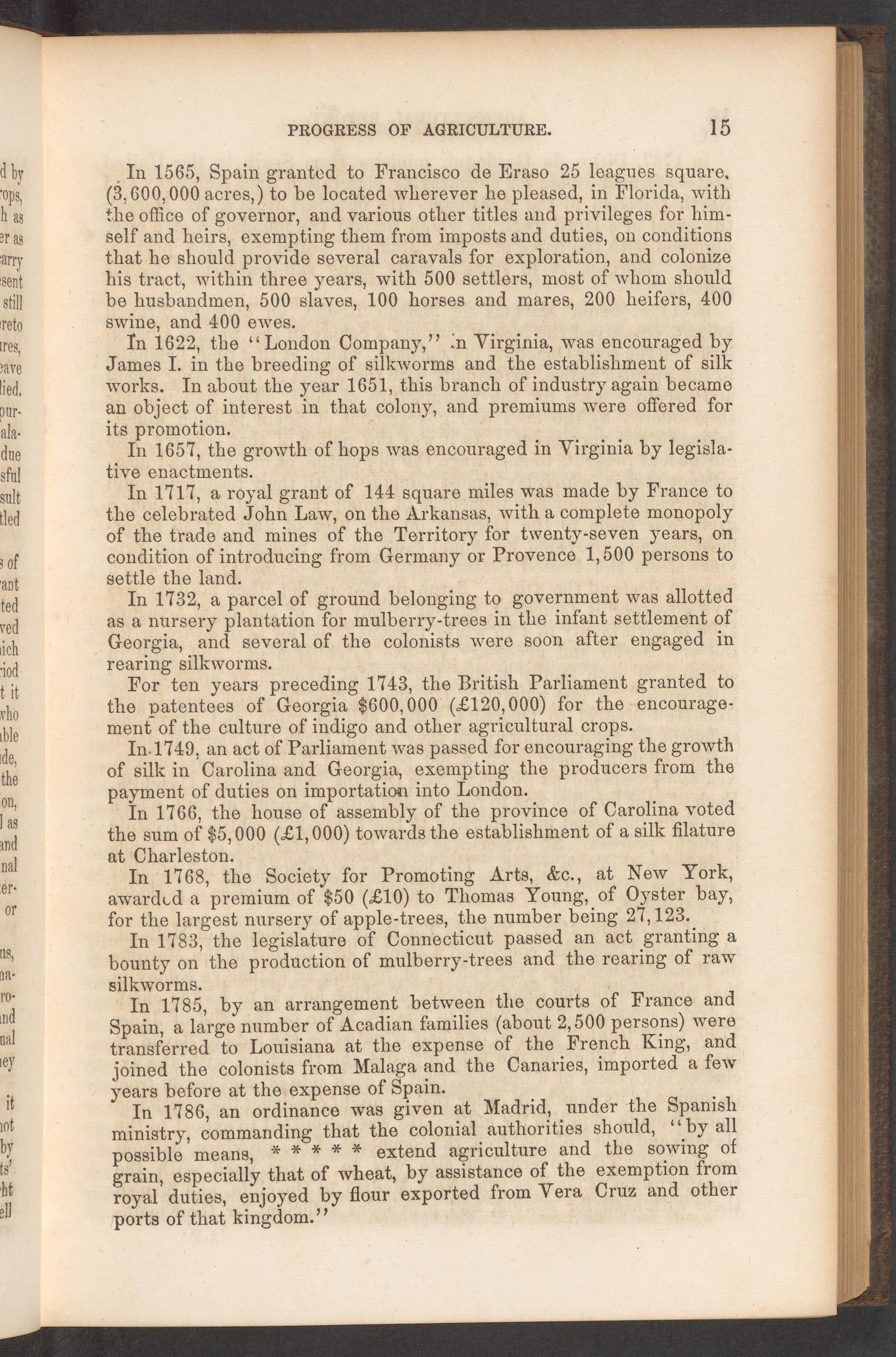 In 1565, Spain granted to Francisco de Eraso 25 leagues square. (3, 600, 000 acres,) to be located wherever he pleased, in Florida, with the office of governor, and various other titles and privileges for him- self and heirs, exempting them from imposts and duties, on conditions that he should provide several caravals for exploration, and colonize his tract, within three years, with 500 settlers, most of whom should be husbandmen, 500 slaves, 100 horses and mares, 200 heifers, 400 swine, and 400 ewes.