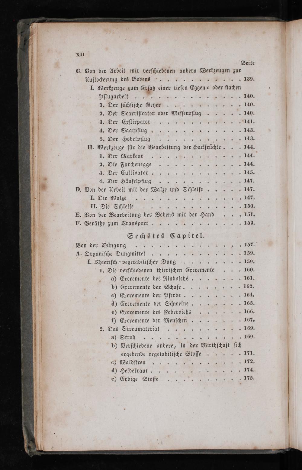 Pflugarbeit....... 1. Der ſächſiſche Geyer....... 2. Der Scarrificator oder Meſſerpflug. 3. Der Erſtirpator.... 4. Der Saatpflug....... 5. Der Hobelpflug........ II. Werkzeuge für die Bearbeitung der Hackfrüchte 4. Der Markeur......... 2. Die Furchenegge...... 3. Der Cullivator........ 4. Der Häufelpflug....... D. Von der Arbeit mit der Walze und Shleife. I. Oie Walze........„. II. Die Schleife........ ⸗ E. Von der Bearbeitung des Bodens mit der Hand F. Geräthe zum Transport.........