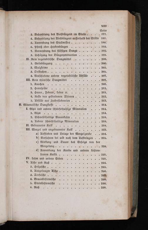 XIII. Seite 3. Behandlung des Viehdüngers im Stalle.... 177. 4. Behandlung des Viehdüngers auſſerhalb der Ställe 181. 5. Anwendung des Stallmiſtes........ 186. 6. Pferch oder Hordendünger........ 193. 7. Verwendung des flüſſigen Dungs...... 195. s. Schätzung der Düngerproduction.... 199. II. Rein vegetabiliſche Dungmittel....... 200. 1. Gründüngung............ 2004 2. Malzkeime........... 1.„ 205. 3. Oelkuchen....... 205. 4. Verſchiedene andere vegetabiliſche Abfälle. 207. III. Rein thieriſche Dungmittel.... 207, 4. Knochen............. 208. 2. Hornſpäne............. 2115 3. Haare, Federn, Leder ꝛc........ 211. 4. Reſte von geſtorbenen Thieren..... 212. 5. Abfälle aus Zuckerſtedereien..... 212. B. Mineraliſche Oungſtoffe............ 213. I. Gips und andere ſchwefelhaltige Mineralien. 214. d. Gips............... 214 2. Schwefelhaltige Braunkohle........ 218. 3. Andere ſchwefelhaltige Mineralien 219. II. Gebrannter Kalk............ 21 III. Mergel und ungebrannter Kalk...... 22 a) Auffinden und Anlage der Mergelgrube. 224. b) Verfahren bei und nach dem Aufbringen. 225. c) Wirkung und Dauer des Erfolgs von der Mergelung.... 228. d) Anwendung der Kreide und andern kohlen⸗ ſauren Kolks.......... 231. IV. Lehm und andere Eren 231. V. Aſche und Ruß.........„.. 234. 4. Holzaſche........ 235. 2. Ausgelaugte Aſche... 236. 3. Torfaſche........„. 237. 4. Braunkohlenaſche......„„... 238. 5. Steinkohlenaſche......... 238. 6. Ruß........... 238,