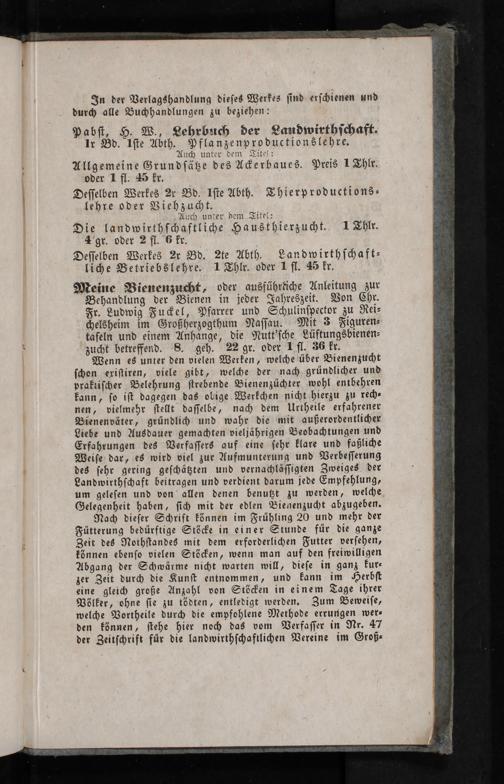 Wenn es unter den vielen Werken, welche über Bienenzucht ſchon exiſtiren, viele gibt, welche der nach gründlicher und praktiſcher Belehrung ſtrebende Bienenzüchter wohl entbehren kann, ſo iſt dagegen das obige Werkchen nicht hierzu zu rech⸗ nen, vielmehr ſtellt daſſelbe, nach dem Urrheile erfahrener Bienenväter, gründlich und wahr die mit außerordentlicher Liebe und Ausdauer gemachten vieljährigen Beobachtungen und Erfahrungen des Verfaſſers auf eine ſehr klare und faßliche Weiſe dar, es wird viel zur Aufmunterung und Verbeſſerung des ſehr gering geſchätzten und vernachläſſigten Zweiges der Landwirthſchaft beitragen und verdient darum jede Empfehlung, um geleſen und von allen denen benutzt zu werden, welche Gelegenheit haben, ſich mit der edlen Bienenzucht abzugeben.