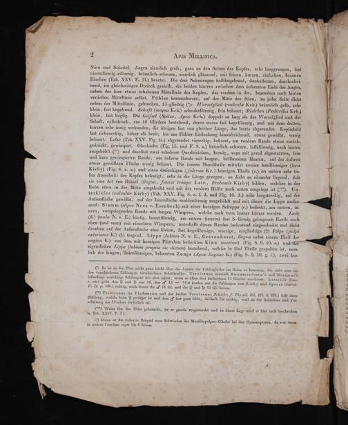 Stirn und Scheitel. Augen ziemlich grols, ganz an den Seiten des Kopfes, schr langgezogen, fast nierenſörmig eiförmig, bräunlich-schwarz, ziemlich glänzend, mit feinen, kurzen, einfachen, braunen Härchen(Tab. MMV. F. 21.) besetzt. Die drei Nebenaugen halbkugelrund, dunkelbraun, durchschei- nend, im gleichseitigen Preieck gestellt, die beiden hintern zwischen dem äuſsersten Ende der Augen, neben der hier etwas erhabenen Mittellinie des Kopfes, das vordere in der, besonders nach hinten vertieften Mittellinie selbst. Fühler braunschwarz, auf der Mitte der Sürn, zu jeder Seite dicht neben der Mittellinie, gebrochen, 13 gliedrig(): VWurzelglied(radicula Krb.) bräunlich- gelb, sehr klein, fast kugelrund. Schaft Gcapus Krb.) schenkelförmig, fein behaart; ielchen(Pedicellus Krb.) klein, fast kuglig. Die Ceiſsel(Silae, Apea Krb.) doppelt so lang als das Wurzelglied und der Schaft, cylindrisch, aus 10 Gliecdern bestehend, deren erstes fast kegelförmig, und mit dem dritten, kurzen sehr innig verbunden, die übrigen fast von gleicher Länge, das letzte abgerundet. Kopfschild fast siebeneckig, höher als breit, bis zur Fühler-Finlenkung hinaufreichend, etwas gewölbt, wenig behaart. Lefze(Tab. XXV. Fig. 14.) abgerundet viereckig, behaart, am vordern Rande etwas zurück- gedrückt, gewimpert. Oberkieſer Fig. 15. und F. S. a.) bräunlich-schwarz, lõffelförmig, nach hinten ausgehöhlt(“*) und daselbst zwei erhabene Querleistchen, hornig, vorn mit gerad abgeslutzten, fein und kurz gewimperten Rande, am äufſsern Rande mit langen, hellbraunen Haaren, auf der äuſsern etwas gewölblen Fläche wenig behaart. Die innern Mundtheile mittelst zweier bandförmiger(Jora Kirby)(Fig. 8. x. X.) und eines dreieckigen(Volcrum Kr.) hornigen Theils(z.) im untern sehr tie- ſen Ausschnilt des Kopſes befestigt, sehr in die Länge gezogen, so dicht an einander liegend, daſs sie eine Art von Rüssel(ingua, Fausse trompe Latr., Proboscis Kirby) bilden, welcher in der Ruhe etwa in der Mitte eingeknikt und mit der vordern Hälfte nach unten umgelegt ist(*). Un- terkiefer(valoulae Kirby)(Tab. XRV. Fig. 8. c. f. d. und Fig. 10. A.) sehr langstreckig, auf der Auſsenfläche gewölbt, auf der Innenfläche muldenförmig ausgehöhlt und mit dieser die Lippe umfas- send: Stamm Gipes Nees v. Esenbeck) mit einer hornigen Schuppe(c.) bedeckt, am untern, in- nern, vorspringenden Rande mit langen Wimpern, welche nach vorn immer kürzer werden. Tade d.) Cnala N. v. E.) häutig, lanzetifõrmig, am untern(innern) fast Sförmig gebogenen Rande nach oben(und vorn) mit eimelnen Wimpern, unterhalb dieses Randes bedeutend eingeschnürt und dicht daneben auf der Auſsenfläche eine kleine, fast kegelförmige, warzige, eingliedrige(4) Palpe(Pulpi æteriores K.)(.) tragend. Lippe(Jabinm M. v. E., Gravenhorst, Iingua nebst einem Theil der vgina K.) aus dem mit hornigen Plättchen bedeckten Kinn(mentum)(Fig. S. 9. 10. e.) und dẽt eigentlichen TLippe(abium proprie sic dictum) bestehend, welche in fünf Theile gespalten ist, nem- lich der langen, linienförmigen, behaarten Zunge(Apea linguae K.)(Fig. 8. 9. 10. g. i.), zwei kur-
