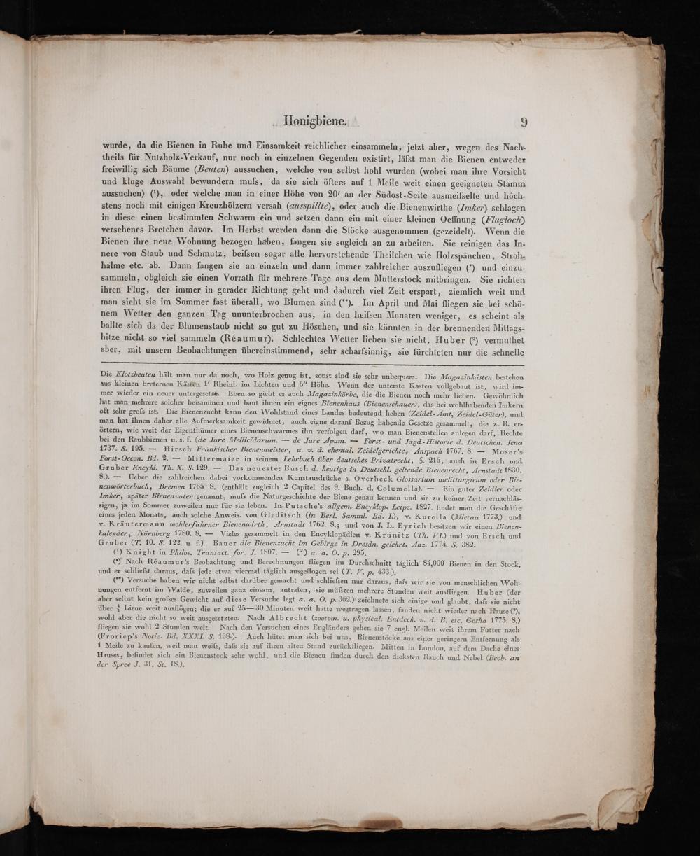 wurde, da die Bienen in Ruhe und EFinsamkeit reichlicher einsammeln, jetzt aber, wegen des Nach- theils für Nutzholz-Verkauf, nur noch in einzelnen Gegenden existirt, läſst man die Bienen entweder freiwillig sich Bäume(Beuten) aussuchen, welche von selbst hohl wurden(wobei wan ihre Vorsicht und kluge Auswahl bewundern muls, da sie sich öfters auf 1 Meile weit einen geeigneten Stamm aussuchen)(), oder welche man in einer Höhe von 20 an der Südost-Seite ausmeiſselte und höch- stens noch mit einigen Kreuzhölzern versah(ausspillte), oder auch die Bienenwirthe ¶Umler) schlagen in diese einen bestimmten Schwarm ein und setzen dann ein mit einer kleinen Oeffnung(Vugloch) versehenes Bretchen davor. Im Herbst werden dann die Slöcke ausgenommen(gezeidelt). Wenn die Bienen ihre neue Wohnung bezogen haben, fangen sie sogleich an zu arbeiten. Sie reinigen das In- nere von Slaub und Schmutz, beiſsen sogar alle hervorstehende Theilchen wie Holzspänchen, Stroh- halme etc. ab. Dann fangen sie an einzeln und dann immer zahlreicher auszufliegen() und einzu- sammeln, obgleich sie einen Vorrath für mehrere Tage aus dem Mutterstock mitbringen. Sie richten ihren Flug, der immer in gerader Richtung geht und dadurch viel Zeit erspart, ziemlich weit und man sicht sie im Sommer fast überall, wo Blumen sind(*). Im April und Mai fliegen sie bei schö- nem Wetter den ganzen Tag ununterbrochen aus, in den heiſsen Monaten weniger, es scheint als ballte sich da der Blumenstaub nicht so gut zu Höschen, und sie könnlen in der brennenden Mittags- hilze nicht so viel sammeln(Réaumur). Schlechtes Wetter lieben sie nicht, Huber() vermulhet aber, mit unsern Beobachtungen übereinstimmend, sehr scharfsinnig, sie fürchleten nur die schnelle