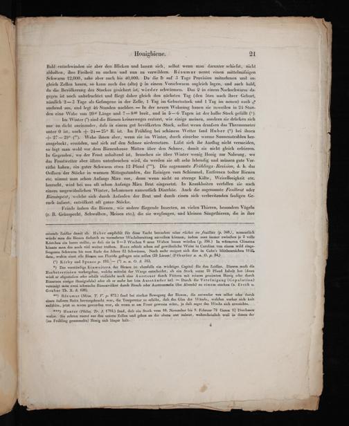 Im Winter() sind die Bienen keinesweges erstarrt, wie einige meinen, sondern sie drücken sich nur so dicht aneinander, daſs in einem gut bevölkerten Stock, selbst wenn drauſsen das Thermometer unter 0 ist, noch+ 24— 250 R. ist. Im Frühling bei schönem Wetter fand Huber(²) bei ihmen + 27— 29(¹). Wehe ihnen aber, wenn sie im Winter, durch eimelne warme Sonnenstrahlen her- ausgelockt, ermüden, und sich auf den Schnee niedersetzen. Lälst sich ihr Ausflug nicht vermeiden, so legt man wohl vor dem Bienenhause Matten über den Schnee, damit sie nicht gleich erfrieren. In Gegenden, wo der Frost anhaltend ist, brauchen sie über Winter wenig Honigz zur Mahrung, wo das Frostwetter aber öfters unterbrochen wird, da werden sie oft sehr lebendig und müssen gute Vor- räthe haben, ein guter Schwarm ctwa 12 Pfund(*). Pie sogenannte Fyiihlings- Meuision, d. h. das Oeffnen der Stöcke in warmen Mittagsstunden, das Reinigen vom Schinnnel, Enifernen todter Bienen etc. nimmt man schon Anfangs März vor, denn wenn nicht zu strenge Kälte, Weisellosigkeit ete. herrscht, wird bei uns oft schon Anfangs März Brut eingesetzt. In Krankheiten verfallen sie nach einem ungewöhnlichen Winter, bekommeu namentlich Piarrhöe. Auch die sogenannte Fnulbrut oder Pienenpest, welche sich durch Anfaulen der Brut und durch einen sich verbreitenden fauligen Ge- ruch äuſsert, entvölkert oft ganze Stöcke.