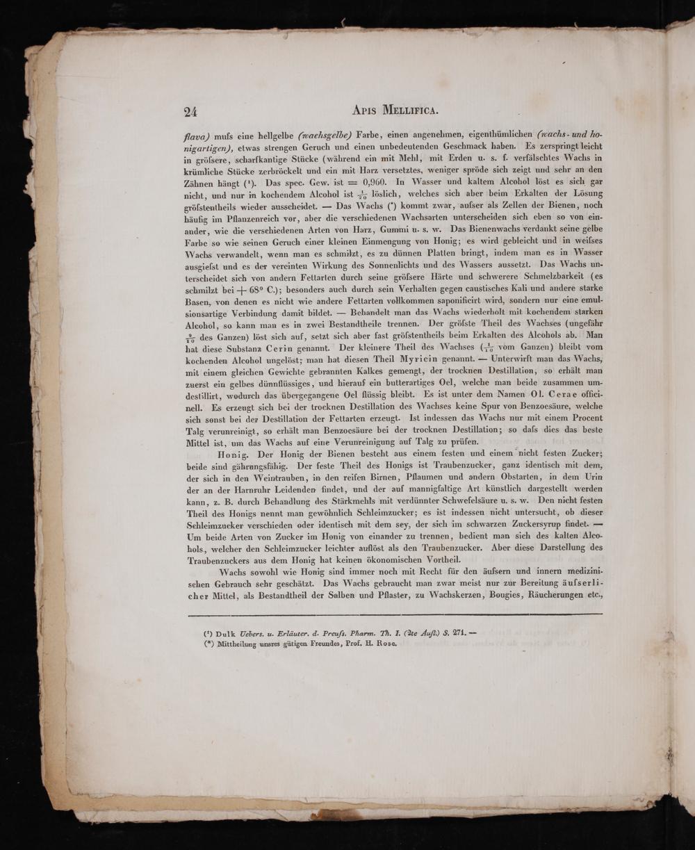 Vava) muſs eine hellgelbe(wachsgelbe) Farbe, einen angenehmen, eigenthümlichen(wachs- und ho- nigartigen), etwas strengen Geruch und einen unbedeutenden Geschmack haben. Es zerspringt leicht in grölsere, scharfkantige Stücke(während ein mit Mehl, mit Erden u. s. f. verfälschtes Wachs in krümliche Stücke zerbröckelt und ein mit Harz versetztes, weniger spröde sich zeigt und sehr an den Zähnen hängt(¹). Das spec. Gew. ist= 0,960. In Wasser und kaltem Alcohol löst es sich gar nicht, und nur in Kochendem Alcohol ist 26 löslich, welches sich aber beim Erkalten der Lösung gröſstentheils wieder ausscheidet.— Das Wachs() kommt zwar, auſser als Zellen der Bienen, noch häußig im Pflanzenreich vor, aber die verschiedenen Wachsarten unterscheiden sich eben so von ein- ander, wie die versehiedenen Arten von Harz, Gummi u. s. w. Das Bienenwachs verdankt seine gelbe Farbe so wie seinen Geruch einer kleinen Finmengung von Honig; es wird gebleicht und in weiſses Wachs verwandelt, wenn man es schmilzt, es zu dünnen Platten bringt, indem man es in Wasser ausgieſst und es der vereinten Wirkung des Sonnenlichts und des Wassers aussetzt. Das Wachs un- terscheidet sich von andern Feitarlen durch seine gröſsere Härte und schwerere Schmelzbarkeit(es Schmilat bei † 680 C.); besonders auch durch sein Verhalten gegen caustisches Kali und andere starke Basen, von denen es nicht wie andere Fettarten vollkommen saponificirt wird, sondern nur eine emul- sionsartige Verbindung damit bildet.— Behandelt man das Wachs wiederholt mit kochendem starken Alcohol, so kann mau es in zwei Bestandtheile trennen. Der grölste Theil des Wachses(ungefähr des Ganzen) löst sich auf, setzt sich aber fast grölstentheils beim Erkalten des Alcohols ab. Man hat diese Substanz Cerin genannt. Der kleinere Theil des Wachses(4% vom Ganzen) bleibt vom bochenden Alcohol ungelöst; man hat diesen Theil Myricin genannt.— Unterwirft man das Wachs, mit einem gleichen Gewichte gebrannten Kalkes gemengt, der trocknen Destillation, so erhält man zuerst ein gelbes dünnflüssiges, und hierauf ein butterartiges Oel, welche man beide zusammen um- destillirt, wodurch das übergegangene Oel flüssig bleibt. Es ist unter dem Namen O1. Cerae offiei- nell. Es erzeugt sich bei der trocknen Destillation des Wachses keine Spur von Benzoesäure, welche Ssich sonst bei der Destillation der Fettarten erzeugt. Ist indessen das Wachs nur mit einem Procent Talg verunreinigt, so erhält man Benzoesäure bei der trocknen Destillation; so dals dies das beste Mittel ist, um das Wachs auf eine Verunreinigung auf Talg zu prüfen.