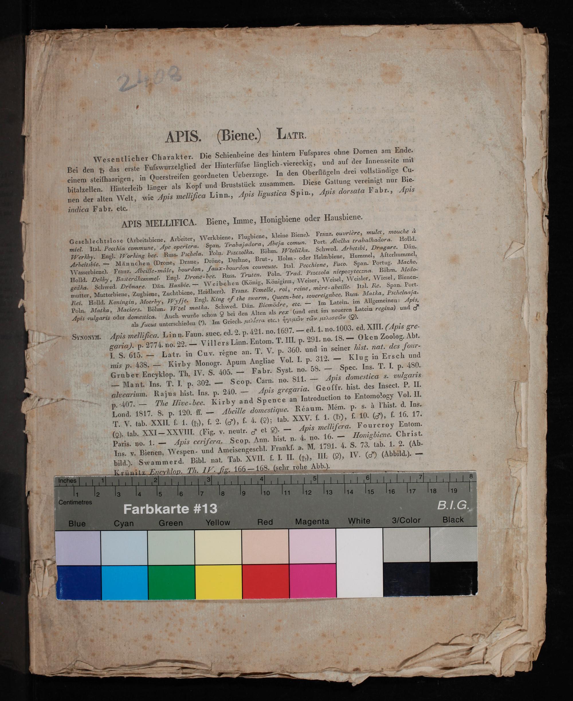 SronM. Apis melliſicu. Lin n· Faun. suec. ed. 2. p. 421. no. 1697.— ed. 1. no. 1003. ed. KIII.(Apis gre guria). p. 2774. no. 22.— villers Linn. Entom. T. III. p. 291. no. 18.— Oken Zoolog. Abt. I. S. 615.— Latr. in Cuv. règne an⸗ T. V. p. 360. und in Seiner Vist. nat. des four- mis p. 438.— Firby Monogr. Apum Angliae Vol. I. p. 312.— Klug in Ersch und Gruber Encykiop. Th. W. S. 405.— Fabr. Syst. no. 58.— Spec. Ins. T. I. P. 480. — Mant. Ins. T. I. p. 302.— Scop. Carn. no. 811.— Apis domestica s. vulguris alveurium. Rajus hist. Ins. p. 240.— Apis gregariu. Geoffr. hist. des Insect. P. II. p. 407.— Vhe Me hee. Kirby and Spence an Introduction to Entomology Vol. II. Lond. 1817. S. p. 120. f.— Abeille domestique. Réaum. Mém. P s. à Thist. d. Ins. P. V. tab. XRII. f. 1.(5), f. 2.() f. 4. G tab. XMV. f. 1.(1),[. 10. G)⸗ f. 16. 17. (Q. lab. XXI— XXVIII.(Fig. v. neutr. ꝙ et W.— Apis mellifera. Foureroy Eniom. Paris. no. 1.— Apis cerifera. Scop. Ann. hist. n. 4. no. 16.— MHonigbiene. Christ. Ins. v. Bienen, Wespen- und Ameisengeschl. Frankf. a. M. 1791. 4. S. 73. tab. 1. 2. Ab- pild). Swammerd. Bibl. nat. Tab. XVII. f. I. II.(10) III- G⸗ IV.(q)(Abbild.).— Krüniz EncrRlon. T. ZM g. 166 168 Cehr rohe Abb.)