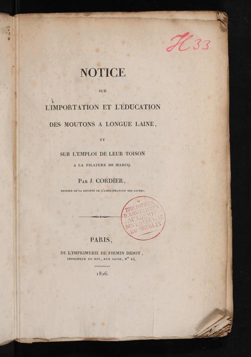 Notice sur l'importation et l'éducation des moutons a longue laine : et sur l'emploi de leur toison a la filature de Marcq / par J. Cordier