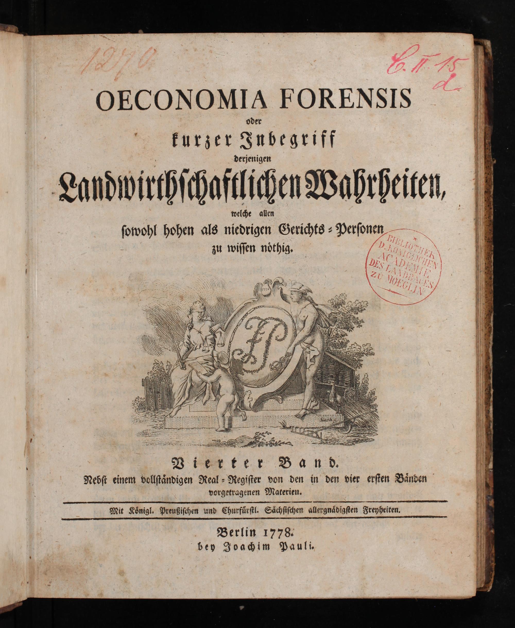 Oeconomia Forensis oder kurzer Inbegriff derjenigen Landwirthschaftlichen Wahrheiten, welche allen sowohl hohen als niedrigen Gerichts-Personen zu wissen nöthig
