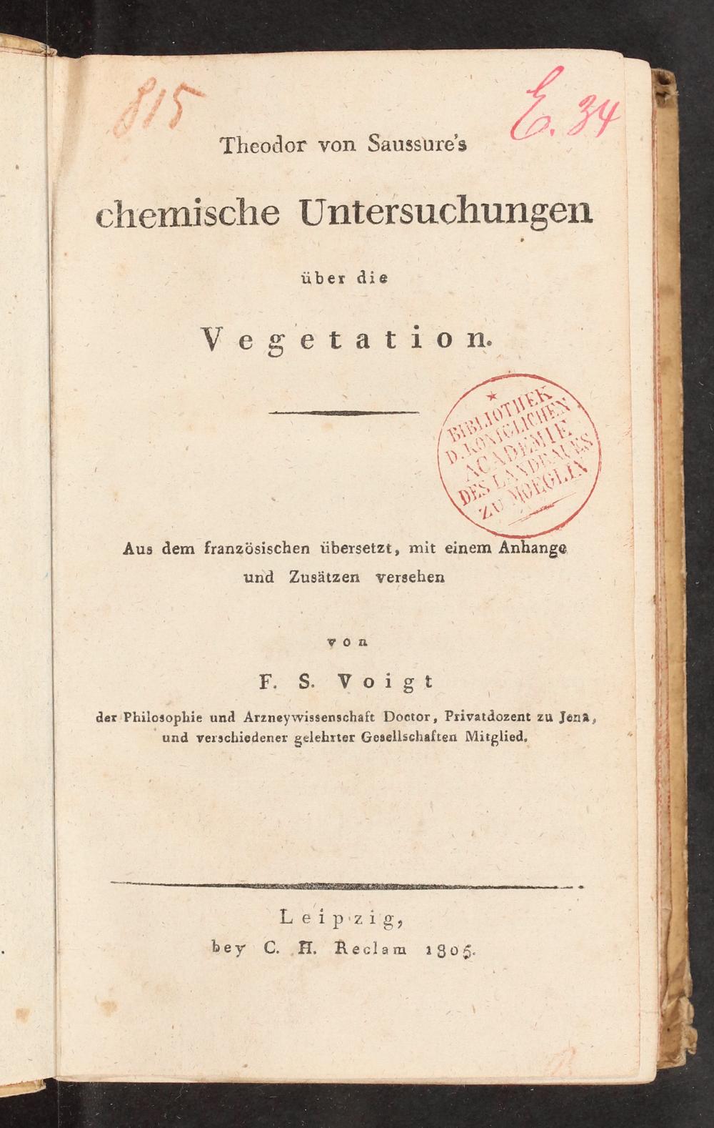 Theodor von Saussure's chemische Untersuchungen über die Vegetation / Aus dem Franz. übers., mit einem Anh. und Zusätzen vers. von Fr. S. Voigt