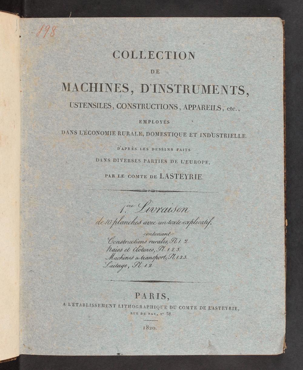 1 (1820) Collection de machines d'instrumens, ustensiles, constructions, appareils, ets. employés dans l'économie rurale, domestique et industrielle. 1
