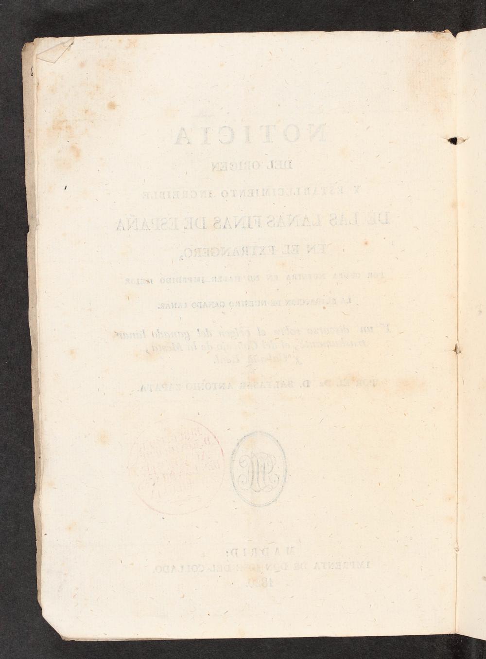 Noticia Del Origen Y Establecimiento Increible De Las Lanas Finas De España En El Extrangero : Por Culpa nuestra En No Haber Impedido Mejor La Extraccion De Nuestro Ganado Lanar : Y un discurso sobre el origen del ganado lanar trashumante, el del Concejo de la Mesta, y Cabaña Real / por El Dr. D. Baltasar Antonio Zapata