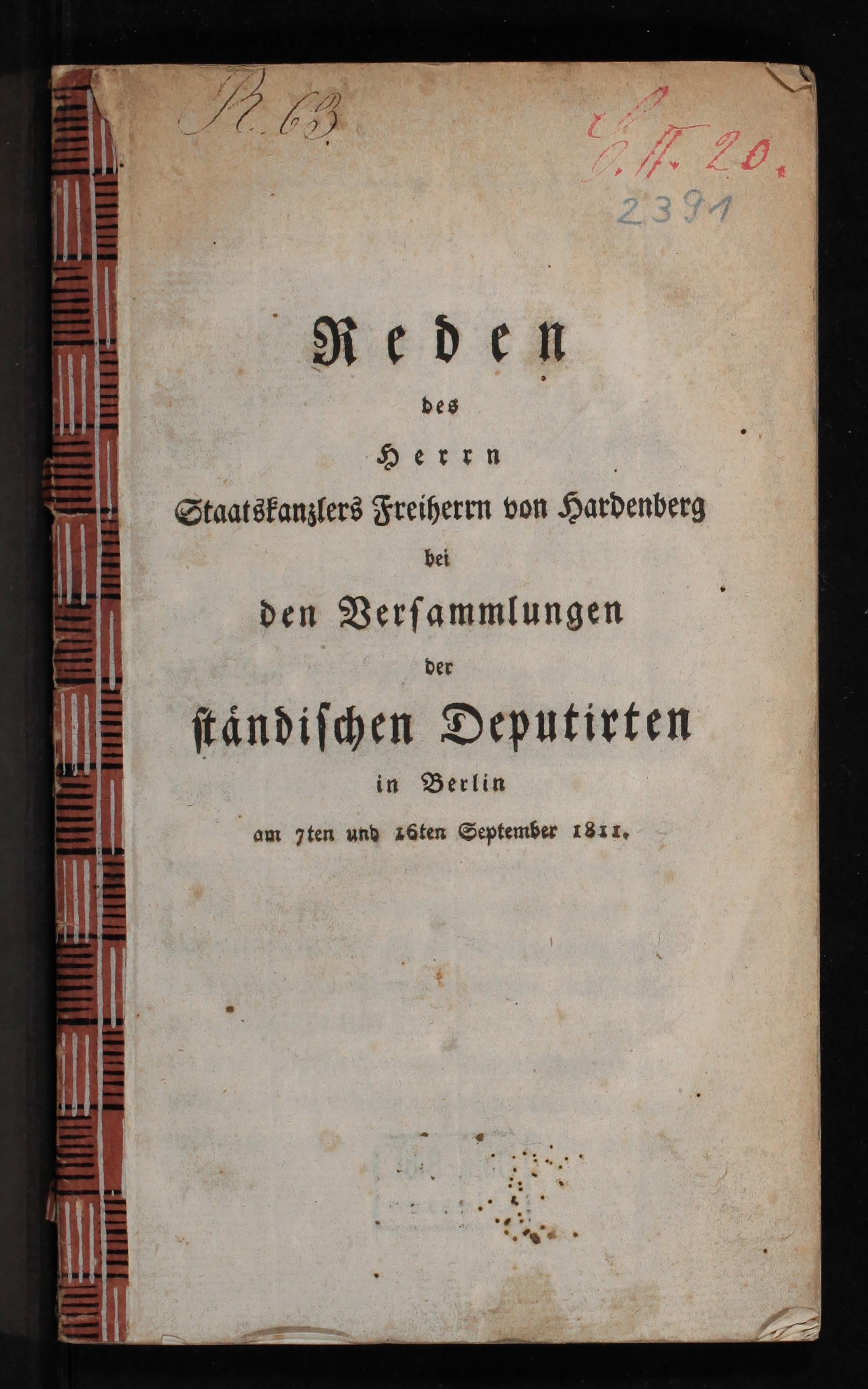 Reden des Herrn Staatskanzlers Freiherrn von Hardenberg bei den Versammlungen der ständischen Deputirten in Berlin, am 7ten und 16ten September 1811