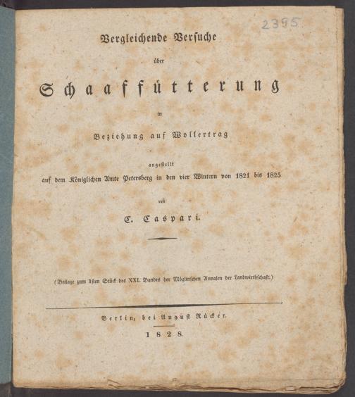 Vergleichende Versuche über Schaaffütterung in Beziehung auf Wollertrag : angestellt auf dem Königlichen Amte Petersberg in den vier Wintern 1821 bis 1825 / von C. Caspari