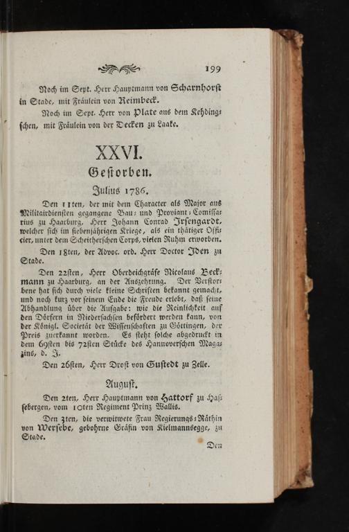 Den 22sten, Herr Oberdeichgräfe Nicolaus Beck; mann zu Haarburg, an der Auszehrung. Der Verstors bene hat sich durch viele kleine Schriften bekannt gemacht, und noch kurz vor seinem Ende die Freude erlebt, daß seine Abhandlung über die Aufgabe: wie die Reinlichkeit auf den Dörfern in Niedersachsen befördert werden kann, von der Königl. Societät der Wissenschaften zu Göttingen, der Preis zuerkannt worden. Es steht solche abgedruckt in dem G69sten bis 72sten Stücke des Hannoverschen Maga 31157d- I6