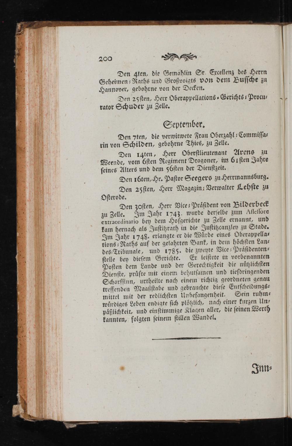 Den zosten, Herr Vice Präsident von Bilderbeck zu Zelle- Zm Jahr 1743. wurde derselbe zum Allellore extraordinario bey dem Hofgerichte zu Zelle ernannt, und kam hernach als Justikrath in die Justißcanzley zu Stade« Im Jahr 1748. ertangte er die Würde eines Oberappella* tions Raths auf der gelahrten Bank, in dem höchsten Lan- des-Tribunale, und 1785. die zweyte Vice: Präsidenten- stelle bey diesem Gerichte. Ex. leistete in vorbenannten Posten dem Lande und der Gerechtigkeit die nüklichsten Dienste, prüfte mit einem behutsamen. und tiefdringenden Scharfsinn, urtheilte nach einem richtig geordneten genau treffenden Maaßstabe und gebrauchte diese Entscheidungs- mittel mit der redlichsten Unbefangenheit. Sein ruhm?- würdiges Leben endigte sich plößlich, nach einer kurzen Un- päßlichkeit, und einstimmige Klagen aller, die seinen Werth kannten, folgten seinem stillen Wandel,