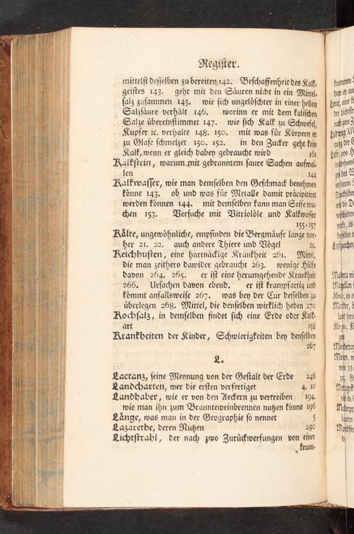 Regiſter. mittelſt deſſelben zubereiten. 142. Beſchaffenheit des Kalt, geiſtes 143. geht mit den Säuren nicht in ein Mittel, ſalz zuſammen 145. wie ſich ungelöſchter in einer helley Salzſäure verhält 146. worinn er mit dem kaliſchen Salze übereinſtimmet 147. wie ſich Kalk zu Schwefel, Kupfer 2c. verhalte 148. 150, mit was für Körpern ex zu Glaſe ſchmelzet 150. 152. in den Zucker geht fein