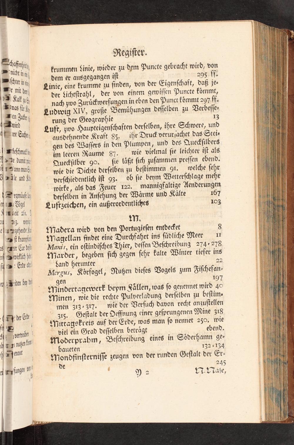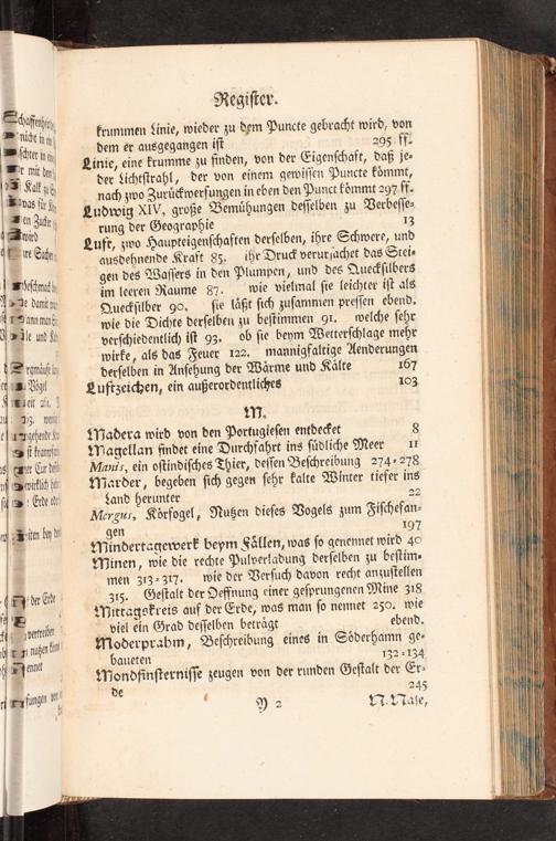 Sheffnhit M In Eſſe Which in krummen Linie, wieder zu dem Puncte gebracht wird, von Wit 19 dem er ausgegangen ff 29541 Wl mit der; Linie, eine krumme zu finden, von der Eigenſchaft, daß je- (ZS Kalt ab der Lichtſtrahl, der von eihem gewiſſen Puncte fömmt, Wives für(» nach zwo Zurüwerfungen in eben den Punct kömmt 297 ff- Wien Zuſe Ludwig X1V, große Bemühungen deſſelben zu Verbeſſe- Muvid| rung der Geographie' 133 4 FE Erf Lufr, zwo Haupteigenſchaften derſelben, ihre Schwere, und T 1, ausdehnende Kraft 83. ihr Dru& verurjachet das Stei- |(echt gen des Waſſers in den Plumpen, und des Quetſilbers "s 6.; im leeren Raume 87. wie vielmal ſie leichter iſt als | M... Queckſilber 90. ſie läßt ſich zuſammen preſſen ebend, "ver N wie die Dichte derſelben zu beſtimmen 91. welche ſehr WJle und ft verſchiedentlich iſt 93. ob ſie beym Wetterſchlage mehr M... wirke, als das Feuer 122. mannigfaltige Aenderungen = romäuf ly derſelben in Anſehung der Wärme und Kälte 167 ; Z 33- PLuftzeichen, ein außerordentliches 103 A Beit 2,! uy 3. wi! t1). gh Madera wird von den Portugieſen entdeFet 8