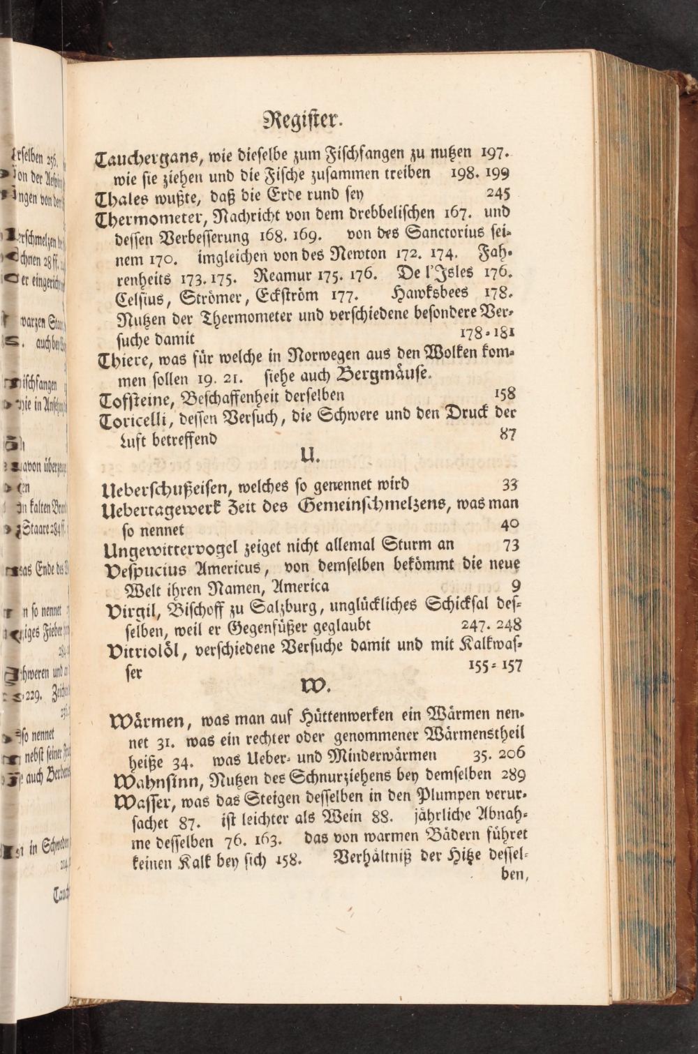 Tauchertgans, wie dieſelbe zum Fiſchfſangen zu nußen 197. wie ſie ziehen und die Fiſche zuſammen treiben 198. 199 Thales wußte, daß vie Erde rund ſey 245 Thermometer, Nachricht von dem drebbeliſchen 167. und deſſen Verbeſſerung 168, 169. von des Sanctorius ſei» nem 170. imgleichen von des Newton 172. 174. Fah- renheits 173. 175. Reamur 175. 176. Del Jsles 176. Celſius, Strömer, E>ſtrom 177. Hawkfsbees 178. Nußen der Thermometer und verſchiedene beſondere Ver-