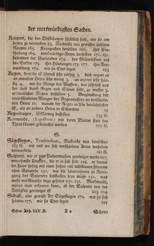 Raupen, die den Obſtbäumen ſchädlich ſind, wie ſie am beſten zu vertreiben 83, Nachricht von gewiſſen falſchen Raupen 165. Kennzeichen derſelben 166. ihre Ein- theilung 169. merfwürdige4Arten derſelben 170, I81. beſonders der ſcharrenden 174.. des Grünrückens auf den Birken 175, ihre Häutungen 175. 177. ihre Ver« wandlung 179.“ wie ſie Eyer legen 183