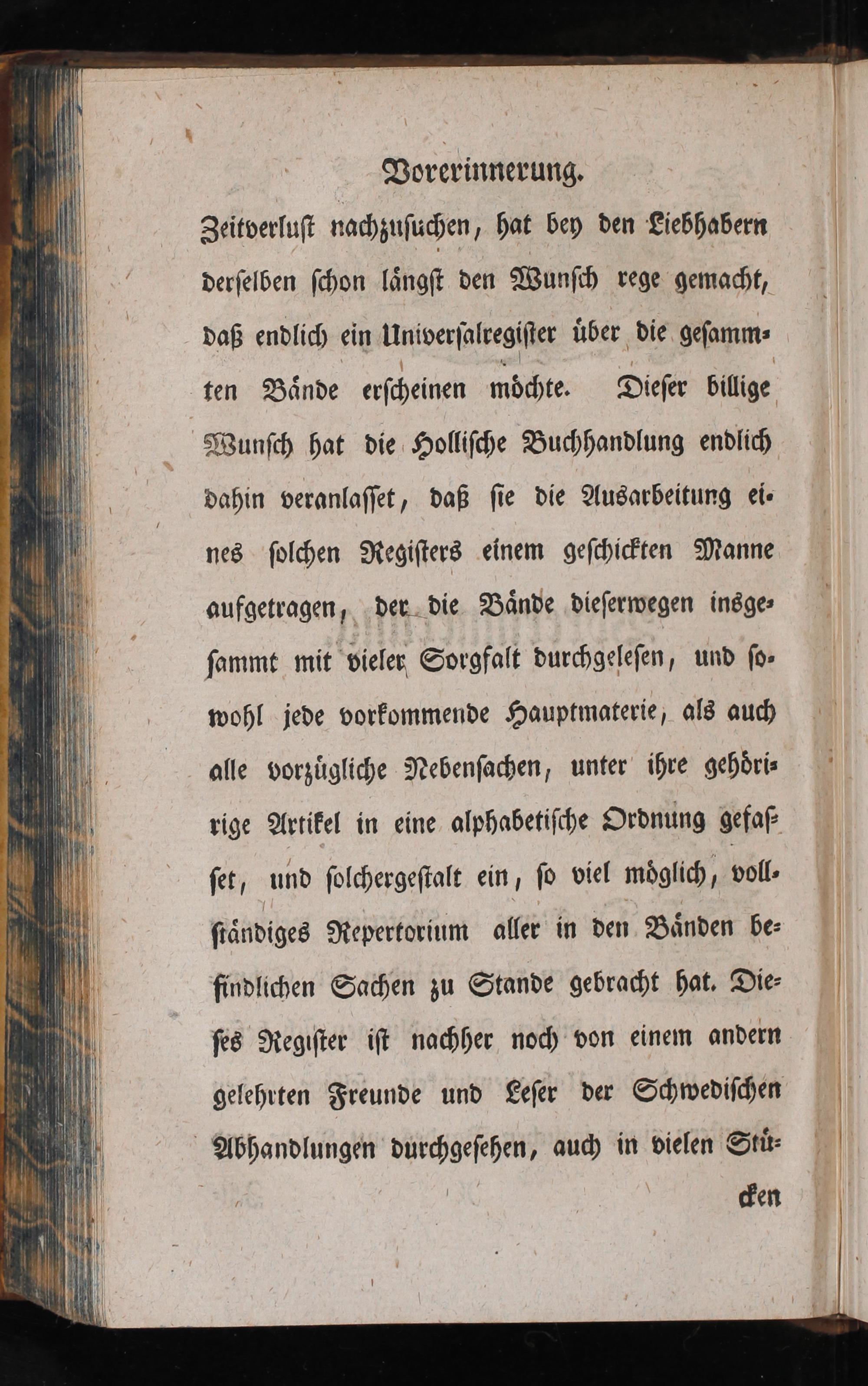 ſet, und ſolchergeſtalt ein ſo viel möglich, voll- ſtändiges Repertorium aller in den Bänden be- findlichen Sachen zu Stande gebracht hat, Die- ſes Regiſter iſt nachher noch von einem andern gelehrten Freunde und Leſer der Schwediſchen - Abhandlungen durchgeſehen, auch in vielen Stü-