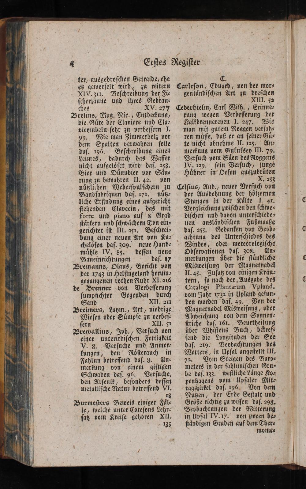 ter, ausgedroſchen Getraide, ehe es gewsorfelt wird, zu reitern XIV. zur. Beſchreibung der Fi- ſcherzäune und ihres Gebrau- chjes XV. 277 Brelins, Mag. Nie., Entdeckung, die Güte der Claviere und Cla- vieymbeln+ſehr zu verbeſſern 1. 99. Wie man Zimmerholz vor dem Spalten verwahren ſolle daſ. 196. Beſchreibung eines Leimes, dadurch das Waſſer nicht aufgelöſet wird daſ. 258, Bier und Dünnbier vor Säu- rung zu bewahren 11. 42. von nüßlichen Weberſpulſedern zu Baäandfabriquen daſ. 17x. nüße- liche Erfindung eines aufgericht ſtehenden Clavecin, das mit Forte und piano auf 8 Grad ſtärkern und ſchwächern Ton ein» gerichtet iſt I1l. 251, Beſchrei- bung einer neuen Art von Ka- <helofen daſ. 309. neue Hand- mühle IV, 85. deſſen neue Baäaueinrichtungen daſ. 387 Zremanns, Olaus, Bericht von der 1743 in Helſingeland herum- gegangenen rothen Ruhr X1. 216 de Brenner von Verbeſſerung ſumpfihter Gegenden durch Sand 11. 211 Breimers, Laym., Art, niedrige Wieſen oder Sümpfe zu verbeſ- ſern XI. 51 Zrewäcllius, Joh., Verſuch von einer unterirdiſchen. Fettigkeit V. 8. Verſuche und Anmer- kungen, den Röſterauch in Fahlun betreffend daſ. 8. An- merfung von einem giftigen Schwaden daſ. 96. Verſuche, den Arſenik, beſonders deſſen metalliſche Natur betreffend VI. IS