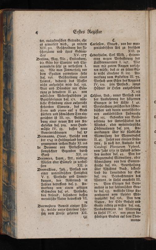 E: Carleſon, Eduard, von der mor- genländiſchen Art zu dreſchen XII. 532 Cederhielm, Carl Wilh., Erinne- rung wegen Verbeſſerung der Kalkbrennereyen 1. 247. Wie man mit gutem Roggen verfah- ren müſſe, daß er an ſeiner Gü- te nicht abnehme I1. 125. An- merfung vom Gufkufksey 111. 79. Verſuch vom Säen des Roggens 1V. 129. ſein Verſuch, junge Hühner in“ Oefen auszubrüten N6r253 Celſius, And., neuer Verſuch von der Ausdehnung der hölzernen Stangen in der Kälte 1. 41. Vergleichung zwiſchen den ſchwe- diſchen und davon unterſchiede- uen ausländiſchen Fußmaaße daſ. 255. Gedanken von Beob- achtung des Unterſchiedes des Windes, oder metevrologiſche Obſervationen daſ. 308. An- merfungen über die ſtündliche Misweiſung der Magnetnadel I1. 45. Zuſaß von einigen Kräu- tern, ſy nach der, Ausgabe des Catalogi Plantarum Vpland. vom Jahr 1732 in Upland gefun- den worden daf. 49. Von der Magnetnadel Misweiſung, oder Abweichung von dem Sonnen- ſtriche daſ. 162. Beurtheilung über Whiſtons Buch, betref fend die Longituden der See daſ. 219. Beobachtungen des Wetters, in Upſal angeſtellt II. 72. Vom Steigen des Baro- meters in der fahluniſchen Gru- be daſ. 133. weſtliche Länge Ko- penhagens vom| Upſaler Mit- tagszirfel daſ. 196. Von dent Nuten, der Erde Geſtalt und Größe richtig zu wiſſen daſ. 298. Bevbachtungen der Witterung in Upfal 1V.17. von zween bes ſiändigen Graden auf dem Ther- momez