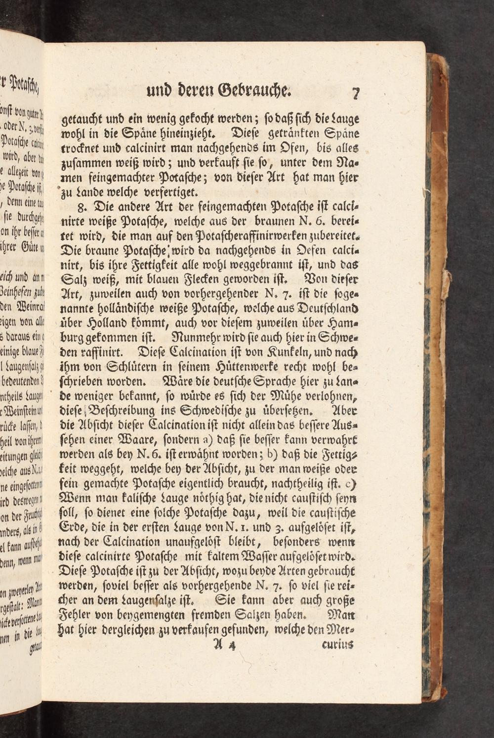 8. Die andere Art der feingemachten Potaſche iſt calci- nirte weiße Potaſche, welche aus der braunen N. 6. berei tet wird, die man auf den Potaſcheraffinirwerken zubereitek« Die braune Potaſche wird da nachgehends in Defen calcia nirt, bis ihre Fettigfeit alle wohl weggebrannt iſt, und das Salz weiß, mit blauen Fle>en geworden iſt, Von dieſer Art, zuweilen auch von vorhergehender N. 7. iſt die ſoges nannte holländiſche weiße Potaſche, welche aus Deutſchland über Holland kömmt, auch vor dieſem zuweilen über Hama burg gekommen iſt. Nunmehr wird ſie auch hier in Schwee- den rafſinirt. Dieſe Calcination iſt von Kunkeln, und nach ihm von Schlütern in ſeinem Hüttenwerke recht wohl bes ſchrieben worden. Wäre die deutſche Sprache hier zu Lans de weniger bekannt, ſo würde es ſich der Mühe verlohnen, dieſe, Beſchreibung ins Schwediſche zu überſeßen. Aber die Abſicht dieſer Calcination iſt nicht allein das beſſere Auss ſehen einer Waare, ſondern a) daß ſie beſſer kann verwahrt werden als bey N. 6. iſterwähnt wordenz b) daß die Fettig? Feit weggeht, welche bey der Abſicht, zu der man weiße oder fein gemachte Potaſche eigentlich braucht, nachtheilig iſt. c) Wenn man kaliſche Lauge nöthig hat, dienicht cauſtiſch ſeyn ſoll, ſo dienet eine ſolche Potaſche dazu, weil die cauſtiſche Erde, die in der erſten Lauge von N. x. und 3. aufgelöſet iſt, nach der Calcination unaufgelöſt bleibt, beſonders wenn dieſe calcinirte Potaſche mit kaltem Waſſer aufgelöſet wird. Dieſe Potaſche iſt zu der Abſicht, wozu beyde Arten gebraucht werden, ſoviel beſſer als vorhergehende N. 7. ſo viel ſie rei- cher an dem Laugenſalze iſt, Sie kann aber auch große Fehler von beygemengten fremden Salzen haben. Man Hat hier dergleichen zu verfaufen gefunden, welche den Mer-
