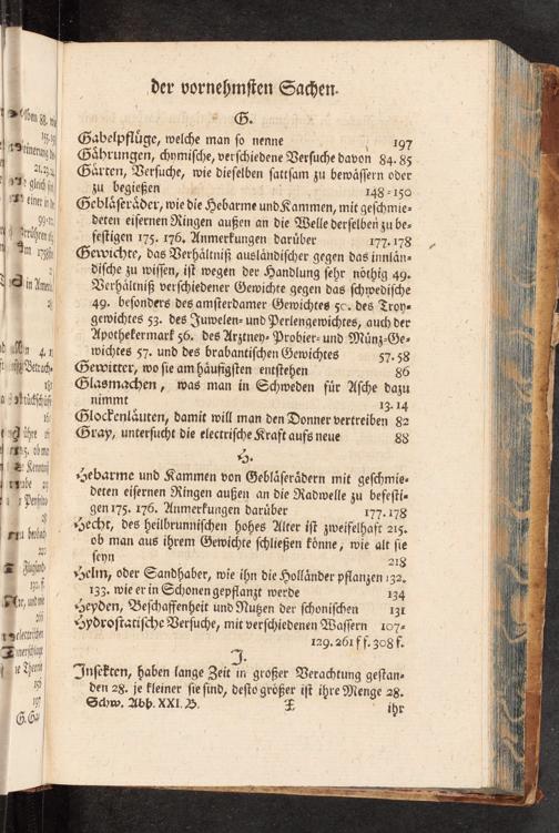 diſche zu wiſſen, iſt wegen der Handlung ſehr nothig 49. Verhältniß verſchiedener Gewichte gegen das ſchwediſche 49. beſonders des amſterdamer Gewichtes 5. des Troy- gewichtes 53. des Juwelen- und Perlengewichtes, auch der Apothefermark 56. des Arztney- Probier- und Münz-Ge- wichtes 57. und des brabantiſchen Gewichtes 57. 58 Gewitter, wo ſie amhäufigſten entſtehen 86 Glasmachen, was man in Schweden für Aſche dazu nimmt 13. 14 Glockenläuten, damit will man den Donner vertreiben 82 Gray, unterſucht die electriſche Kraft aufs neue 88