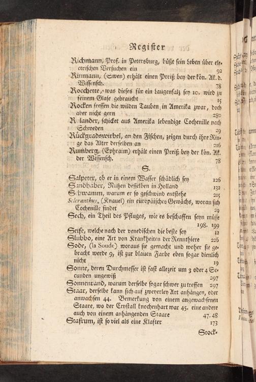 Seife, welche nach der venediſchen die beſte ſey es Slubbo, eine Art von Krankheiten der Rennthiere 226 Sode,(la Soude) woraus ſie gemacht und woher ſie ge- bracht werde 9, iſt zur blauen Farbe eben ſogar dienlich niht 19 Sonne, deren Durchmeſſer iſt faſt allezeit um 3 oder 4 Se- cunden ungewiß; 297 Sonnenrand, warum derſelbe ſogar ſchwer zu freffen 297 Staar, derſelbe kann ſich auf zweyerley Art anhängen, oder anwachſen 44. Bemerkung von einem angewachſenen Staare, wo der Cryſtall knochenhart war 45. eine andere auch von einem anhängenden Staare 47.48 Stafrum, iſt ſo viel als eine Klafter.; 173 Stock-