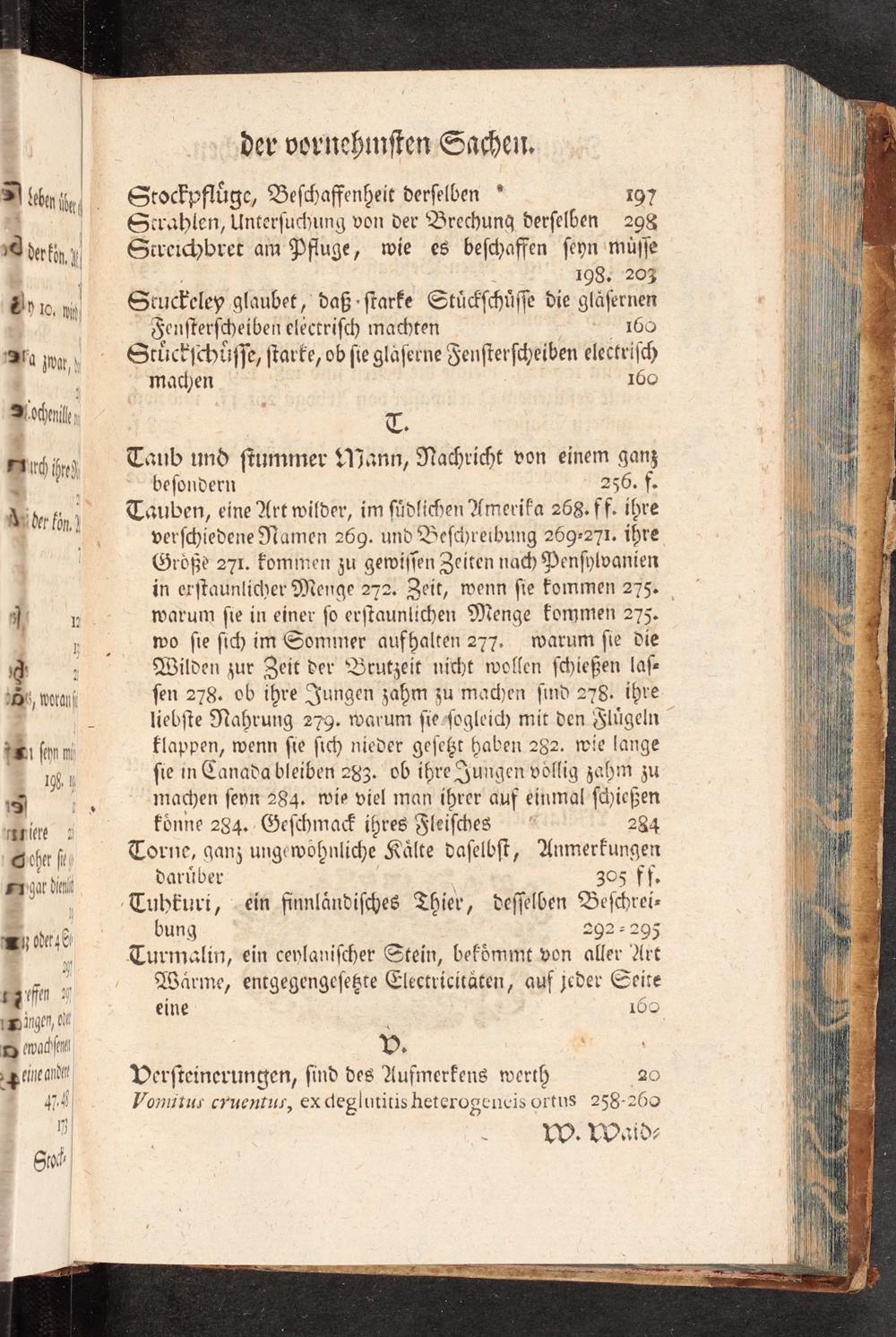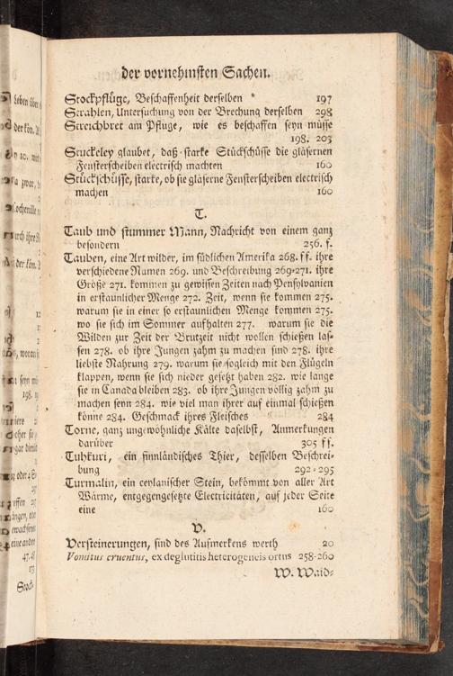 Tauben, eine Art wilder, im ſüdlichen Amerika 268. ff. ihre verſchiedene Namen 269. und Beſchreibung 269-271. ihre Größe 271. kommen zu gewiſſen Zeiten nach Penſylvanien in erſtaunlicher Menge 272. Zeit, wenn ſie kommen 275. warum ſie in einer ſo erſtaunlichen Menge kommen 275. wo ſie ſich im Sommer aufhalten 277. warum ſie die Wilden zur Zeit der Brutzeit nicht wollen ſchießen laſ- ſen 278. ob ihre Jungen zahm zu machen ſind 278. ihre
