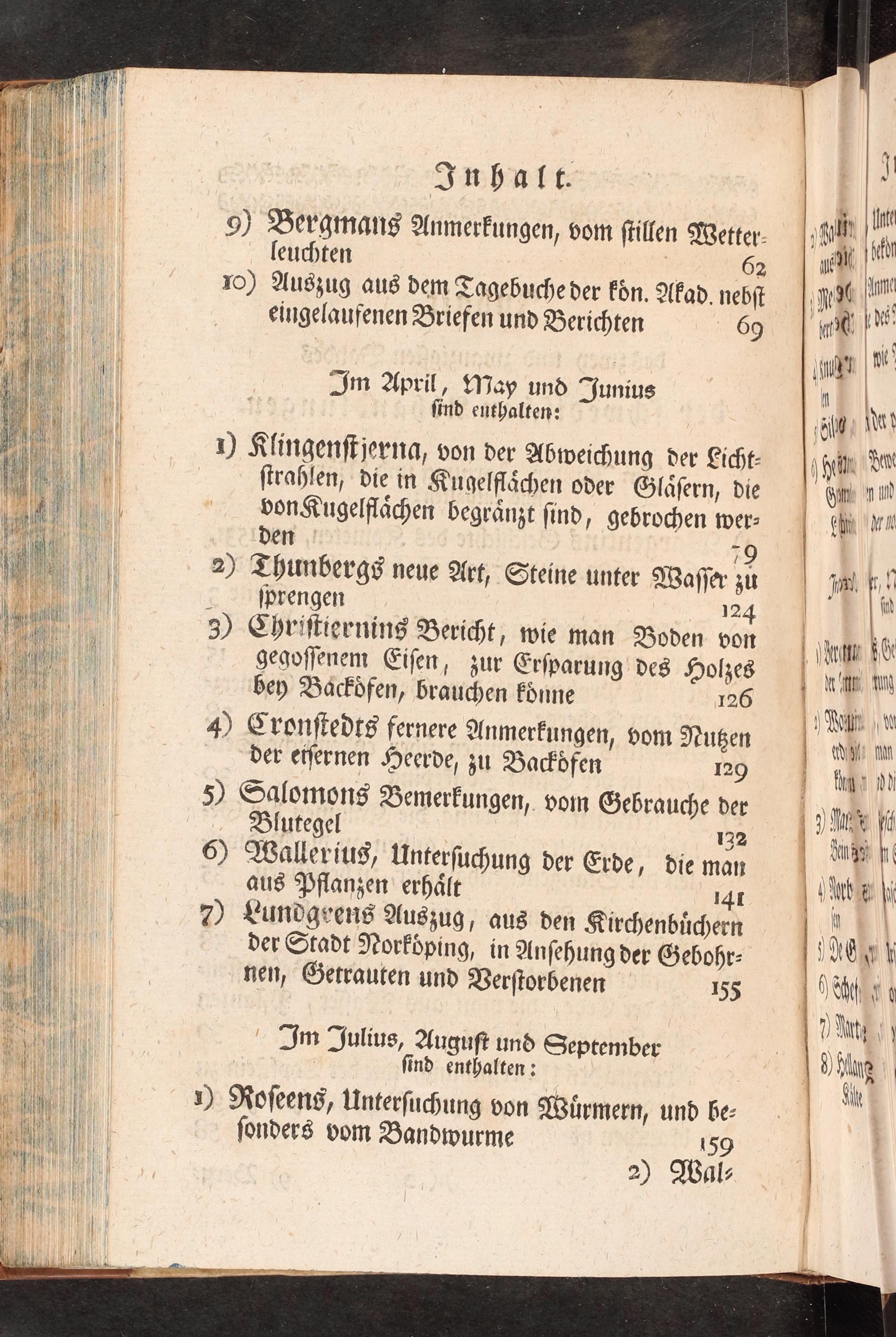5) Salomons Bemerkungen, vom Gebrauche der Blutegel 132 6) Wallerius, Unterſuchung der Erde, die man aus Pflanzen erhält 141 7) Lundgrens Ausgzug, aus den Kirchenbüchern der Stadt Norköping, in Anſehung der Gebohr- nen, Getrauten und Verſtorbenen 155
