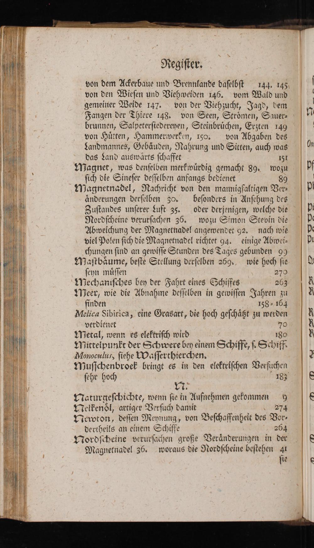 Zuſtandes unſerer Luft 35. oder derjenigen, welche die Nordſcheine verurſachen 36. wozu Simon Stevin die Abweichung der Magnetnadel angewendet 92, nach wie ; viel Polen ſich die Magnetnadel richtet f 94. einige Abwei- „hungen ſind an gewiſſe Stunden des Tages gebunden 99 Maſtbäume, beſte Stellung derſelben 269«, wie hoch ſie