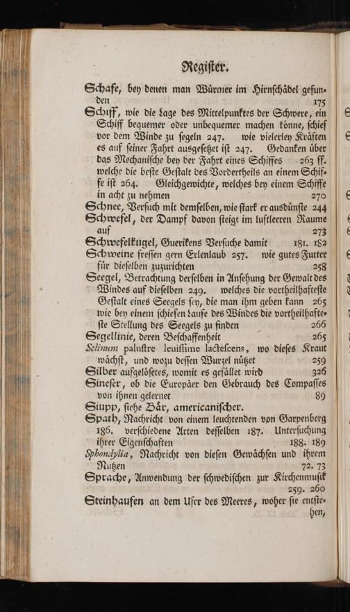 fe iſt 264: Gleichgewichte, welches bey einem Schiffe in acht zu nehmen 270 Schnee, Verſuch mit demſelben, wie ſtark er ausdünſte 244 Schwefel, der Dampf davon ſteigt im luftleeren Raume| 273| Sc<wefelkugel, Guerikens Verſuche damit I81..182| Schweine freſſen gern Erlenlaub 257. wie gutes Futter| für dieſelben zuzurichten 258| Seegel, Betrachtung derſelben in Anſehung der Gewalt des * Windes auf dieſelben 249. welches die vortheilhafteſte Geſtalt eines Seegels ſey, die man ihm geben kann 265 wie bey einem ſchiefen Laufe des Windes die vortheilhaſte-