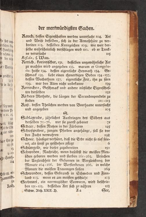 139- war den Alten nicht unbekannt 139 Retrischein, Geſchmack und andere nüßliche Eigenſchaf- ten derſelben 132 Richers Methode, die Längen der Secundenpendeln zu finden 210- 213 Ruß, deſſen Theilchen werden von Boerhaave unterſucht und angegeben IOS S. Sahlacgrube, jährliches Ausbringen des Silbers aus derſelben 70-76. wer ſie zuerſt gebauet 71 Schart, deſſen Nußen in der Färberey 145-