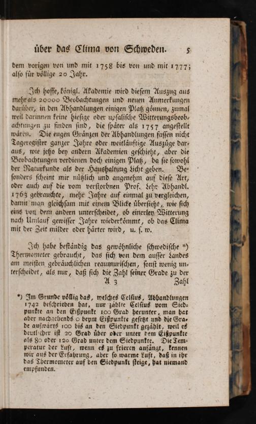 Th habe beſtändig: das gewöhnliche ſchwediſche*) Thermometer gebraucht, das ſich, von dem auſſer Landes am meiſten gebräuchlichen reaumuriſchen, ſonſt wenig un- tkerſcheidet, als nur, daß ſich die Zahl ſeiner Grade zu der