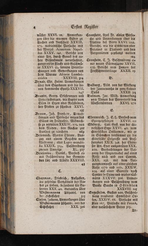 Ehrenreich, IJ. E.L. Verſuch vom Spargelpflanzen XXVUIl. 221 BEkeberg, Cart Guſt. von der<i- nefiſchen Soye KXV1. 40. vom <ineſiſchen Oelſaamen, wie er in Schweden fortkömmt 335. die <ineſiſche Oelpreſſe und Preſ- ſungsart XXIUX. 348. der Chine- ſer Art, Eyer auszubrüten XXX. 202. Beobachtungen der Nei- gung der Magnetnadel auf einer Reiſe nach und von Canton. XXX. 238. mit dem Nei- gungscompaſſe auf einer gleichen Reiſe 1770 und 1771. XXX1V. 254. auf einer Seereiſe nach - Eanton in China und wieder rück- wärts- XXX VIU!,. 306. Anmer- kungen und Beſchreibung vom Banka Sunde in Oſtindien XXXVI 125 Entgzeſtiröm, Guſtav von, Beſchrei- bung tragbarer<ymiſcher Oe- fen; XXXIV. 66. Verſuche mit Kien 167, Verſuche mit Pounä, oder natürlichem Boyax vs n-