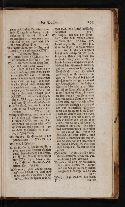 fio> unter dem rechten Opale vorkommenden XXXiX. 317. damit angeßellte Verſuche 319. iſt in der That eine Abänderung 3209. wer dergleicjen mehrere beſißt und unterſucht hat 321f. dreyerley Arten deſſelben 321. vielleicht auch eine vierte, ſo durch Farben. unterſchieden 322 f. die doch feine Species beſttmmen, und unter einander brechen 323. Beſchaffenheit und Verhalten derſelben in verſchiedenen Verſu- <en 323f. der Grundſtoff ſcheint eineThonerd2324. 333. wie es mit dar Durchſichtigkeit in füßigen Materien ſich verhält 324 1: Vers hältniß des Zuwachſes derShwe- re 325f. was der Glanz, den wan an ihm, wenn er der Sonne oder hellbrennenden Lichtäamme aus- geſeßt wird, bemerkt z wie baid er die Durchſichtigkeit verliert 326. daß das wieneriſche Weltauge nicht das wahre 326 f. die Eigen- ſchaft, im Waſſer klar. zu werden, gehört ihm nicht allein zu 327 Ff ei- nige Schriften von ihn 323. ob es ein Calcedon, oder Cacholong 330. Chalcedone und Opale find ſeine nächſten Verwandien 333. worinn ſie ihm ähnlich 334. woher die Undurchſichtigfeit rührt, und warum ſie imWaſſer vergehet 335. wie diegelbe Farbe wegzubringen oder zu ſchwächen 335 f. Salzſäure vder.Königswaſſer machtihn noch gelber 336 Weltmeer, ſ. Hydroſiatiſche, imgl. thermometriſche Verſuche. Ver- minderung des Waſſers Wenner, umgiebt die Kinnekulle weſt- und nordwärts; darauf und auf den umliegenden Felſen wachſende G?wächſe XXXV, 88*) Yoertt, iſt zu Dochten bey Talg- N 2 lichtern