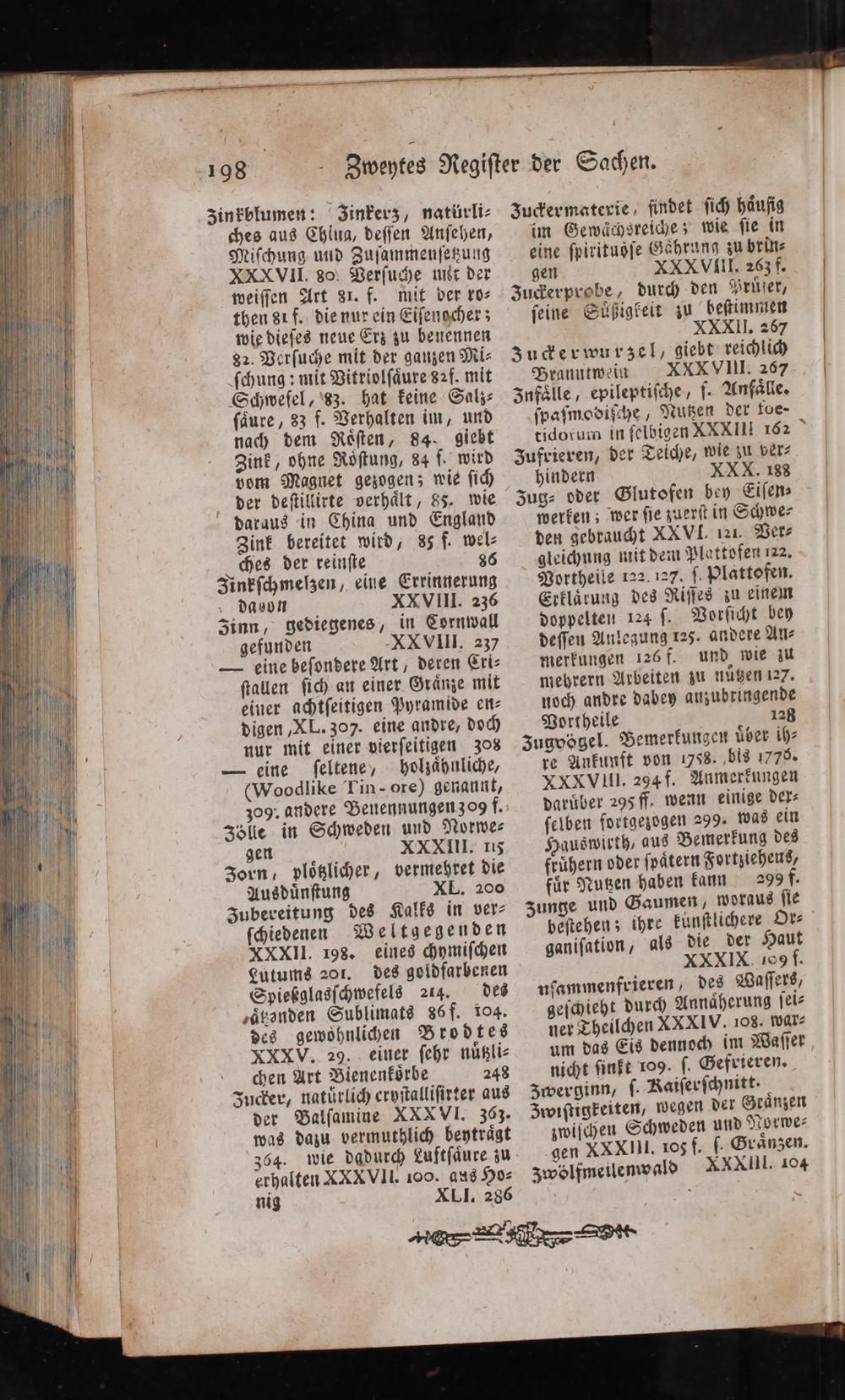 Zinkblumen: Zinkerz, natürli- ches aus China, deſſen Anſehen, Niſchung und Zuſammenſeßung XXXVII 80: Verſuche mit der weiſſen Art 31. f. mit ver ro- then 81 f. dienuy ein Eiſengcher 3