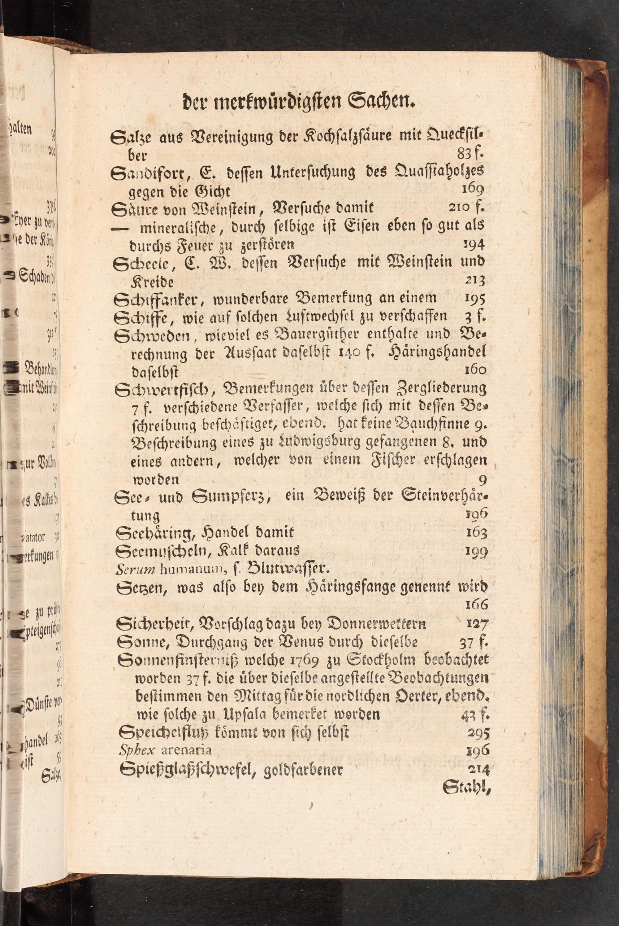 Serum humanum, f. Blutwaſſer. Setzen, was alſo bey dem Häaringsfange genenn? wird 166 Sicherheit, Vorſchlag dazu bey Donnerwettern 127 Sonne, Durchgang der Venus durch dieſelbe 37 f. Sonnenfinſteruß welche 1769 zu Stockholm beobachtet worden 37 f. die über dieſelbe angeſtellte Beobachtungen beſtimmen den Mittag für die nordlichen ODerter, ebend.