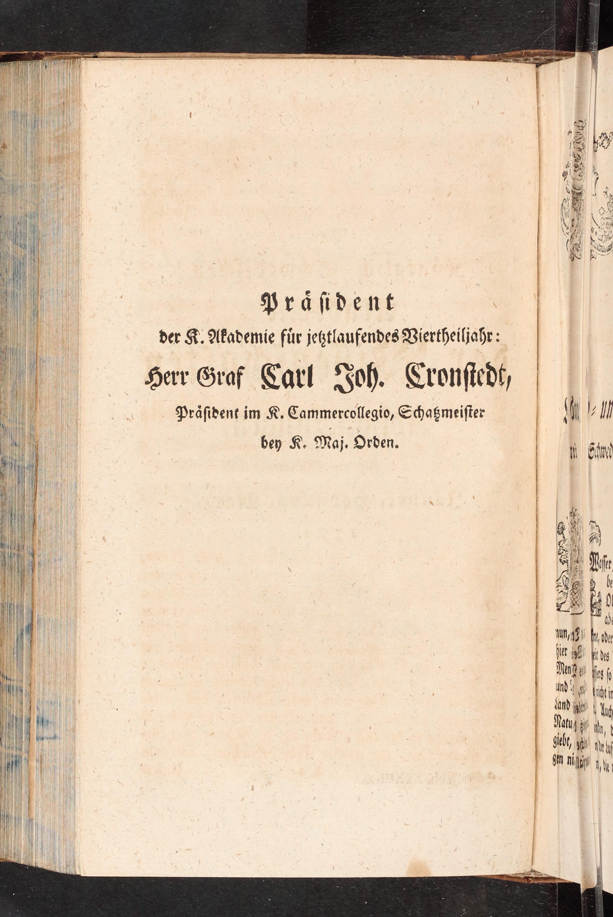 Präſident der K. Akademie für jeßtlaufendes Viertheiljahr: Herr Graf Carl Joh. Cronſtedt, Präſident im K. Cammercollegio, Schaßmeiſter bey K. Maj. Orden.