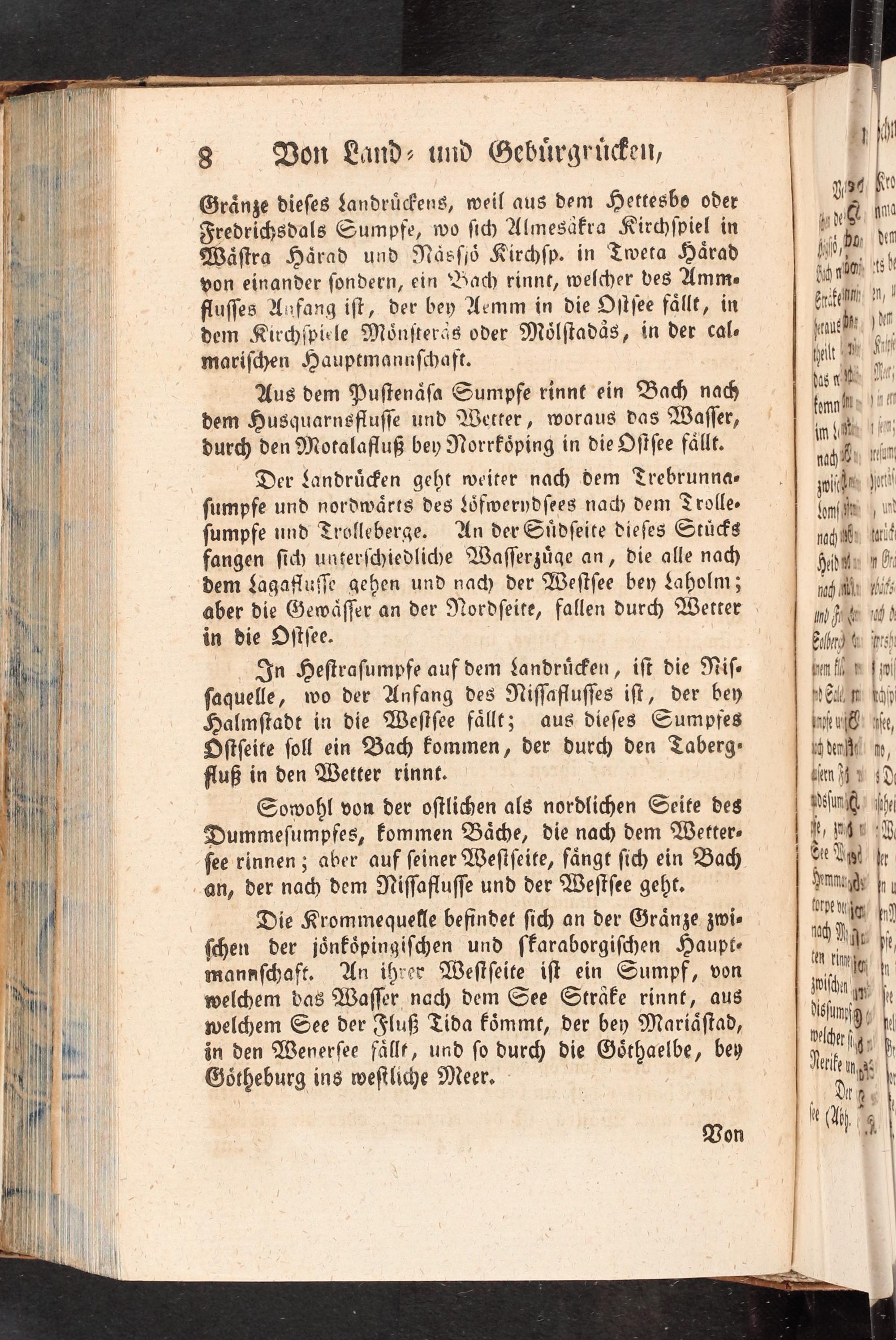 Die Krommequelle befindet ſich an der Gränze zwi- ſchen der jönköpingiſchen und ſfkaraborgiſchen Haupt- mannſchaft. An ihrer Weſtſeite iſt ein Sumpf, von welchem das Waſſer nac dem See Sträke rinnt, aus welchem See der Fluß Tida kömmt, der bey Mariäſtad, in den Wenerſee fällt, und ſo durch die Göthaelbe, bey Götheburg ins weſtliche Meer,-