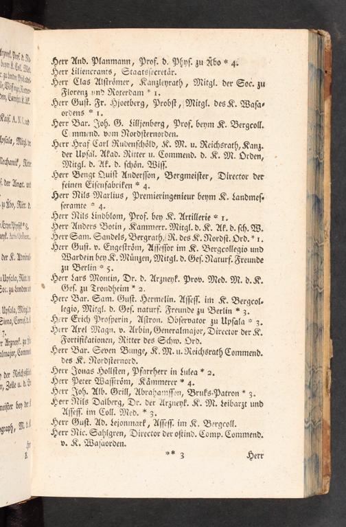 Geſ. zu Trondheim* 2. Here Bar. Sam. Guſt. Hermelin. Aſſeſſ. im K. Bergcol- legio, Mitgl, d. Geſ, naturf. Freunde zu Berlin* 3. Herr Erich Proſperin, Aſtron. Obſervator zu Upſala* 3. Herr Arel Magn. v. Arbin, Generalmajor, Director der K. Fortifikationen, Nitter des Schw. Ord.