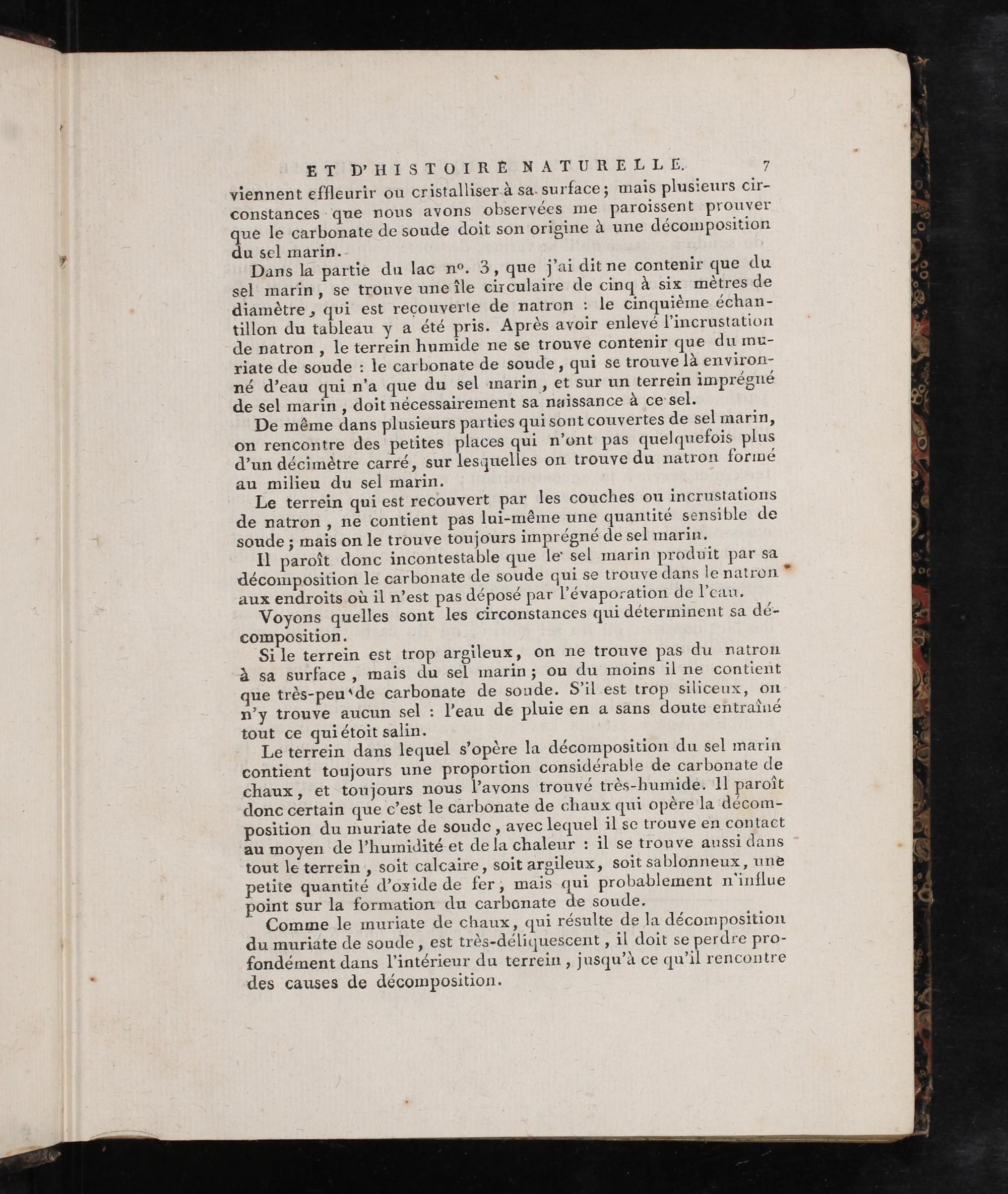 Il paroît donc incontestable que le sel marin produit par sa décomposition le carbonate de soude qui se trouve dans le natron aux endroits où il n’est pas déposé par l’évaporation de l’eau.