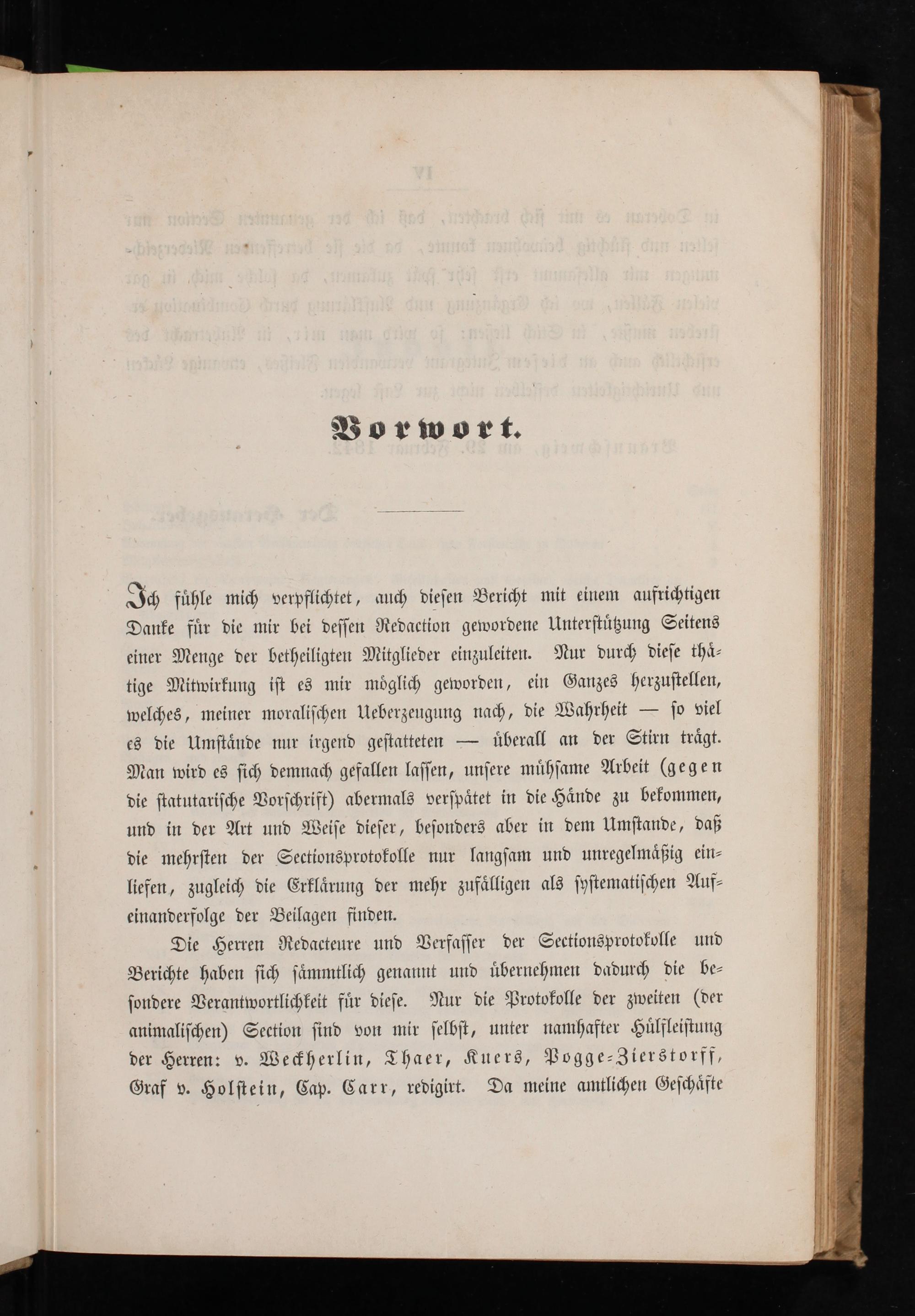 Die Herren Redacteure und Verfasser der Sectionsprotokolle und Berichte haben sich sämmtlich genannt und übernehmen dadurch die be⸗ sondere Verantwortlichkeit für diese. Nur die Protokolle der zweiten(der animalischen) Section sind von mir selbst, unter namhafter Hülfleistung der Herren: v. Weckherlin, Thaer, Kuers, Pogge-Zierstorff, Graf v. Holstein, Cap. Carr, redigirt. Da meine amtlichen Geschäfte