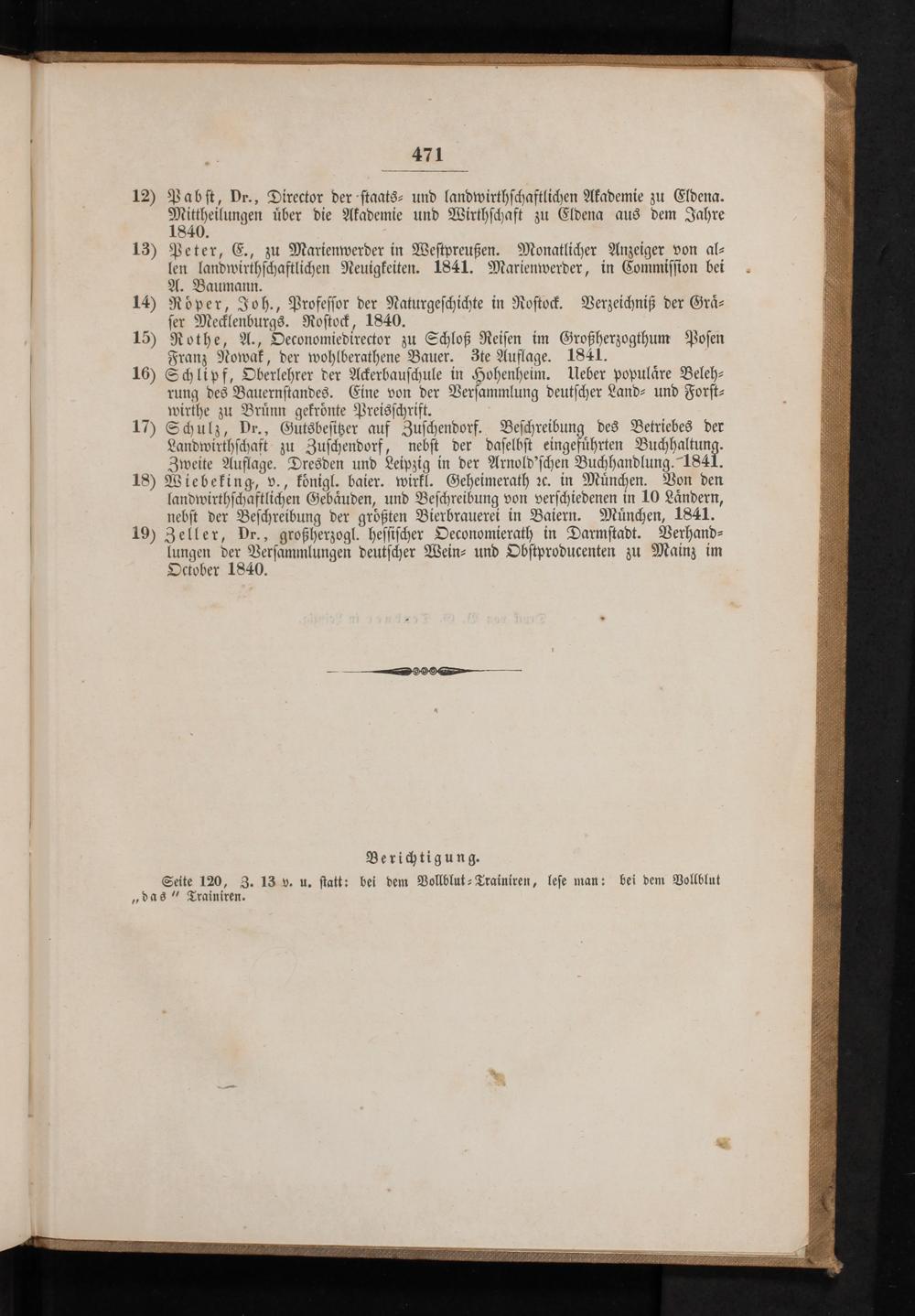 Pabst, Dr., Director der staats- und landwirthschaftlichen Akademie zu Eldena. 1600 0 über die Akademie und Wirthschaft zu Eldena aus dem Jahre 40. Peter, E., zu Marienwerder in Westpreußen. Monatlicher Anzeiger von al⸗ len landwirthschaftlichen Neuigkeiten. 1841. Marienwerder, in Commission bei A. Baumann. Röper, Joh., Professor der Naturgeschichte in Rostock. Verzeichniß der Grä⸗ ser Mecklenburgs. Rostock, 1840. Rothe, A., Oeconomiedirector zu Schloß Reisen im Großherzogthum Posen Franz Nowak, der wohlberathene Bauer. Zte Auflage. 1841. Schlipf, Oberlehrer der Ackerbauschule in Hohenheim. Ueber populäre Beleh⸗ rung des Bauernstandes. Eine von der Versammlung deutscher Land- und Forst— wirthe zu Brünn gekrönte Preisschrift. Schulz, Dr., Gutsbesitzer auf Zuschendorf. Beschreibung des Betriebes der Landwirthschaft zu Zuschendorf, nebst der daselbst eingeführten el84l Zweite Auflage. Dresden und Leipzig in der Arnold'schen Buchhandlung. 1841. Wiebeking, v., königl. baier. wirkl. Geheimerath ꝛc. in München. Von den landwirthschaftlichen Gebäuden, und Beschreibung von verschiedenen in 10 Ländern, nebst der Beschreibung der größten Bierbrauerei in Baiern. München, 1841. Zeller, Dr., großherzogl. hessischer Oeconomierath in Darmstadt. Verhand⸗ lungen der Versammlungen deutscher Wein- und Obstproducenten zu Mainz im October 1840.